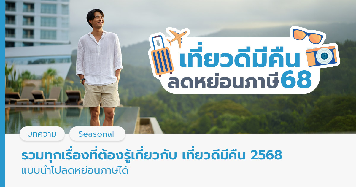 | สำหรับใครที่กำลังมองหาที่เที่ยวช่วงปลายปี ถึงเวลาเตรียมตัวได้เลย! หลังจากที่รัฐบาลได้ออกมาตรการ “เที่ยวดีมีคืน 2568” เพื่อกระตุ้นเศรษฐกิจและการท่องเที่ยวภายในประเทศช่วงปลายปีนี้ ซึ่งทำให้ผู้ที่ลงทะเบียนเข้าร่วโครงการเที่ยวดีมีคืน สามารถนำค่าใช้จ่ายจากการท่องเที่ยวมาลดหย่อนภาษีเงินได้บุคคลธรรมดาได้สูงสุดถึง 30,000 บาท |
