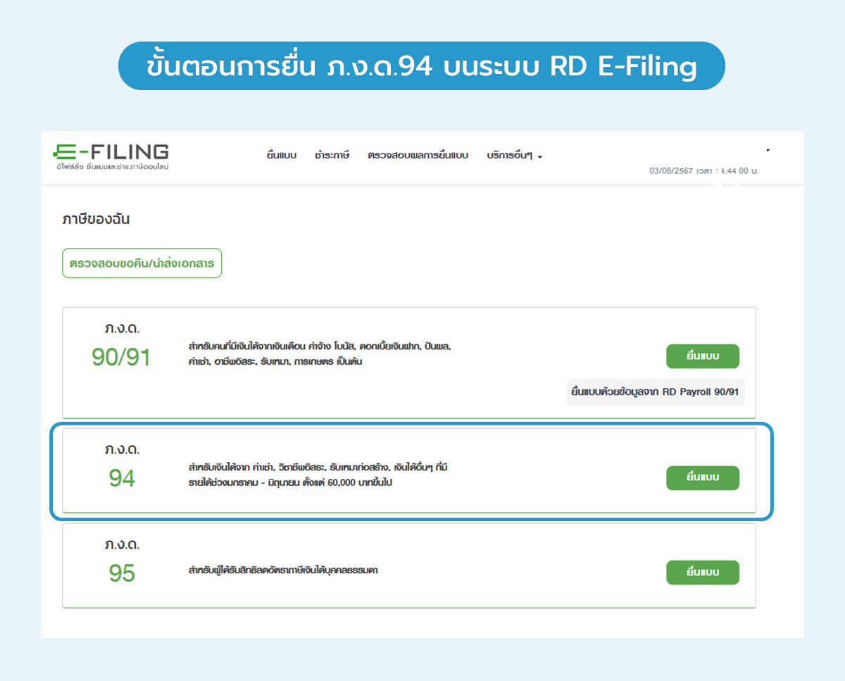 ขั้นตอนที่ 2 คลิกเลือก ภ.ง.ด.94 สำหรับเงินได้จาก ค่าเช่า, วิชาชีพอิสระ, รับเหมาก่อสร้าง, เงินได้อื่นๆ ที่มีรายได้ช่วง มกราคม - มิถุนายน ตั้งแต่ 60,000 บาทขึ้นไป
