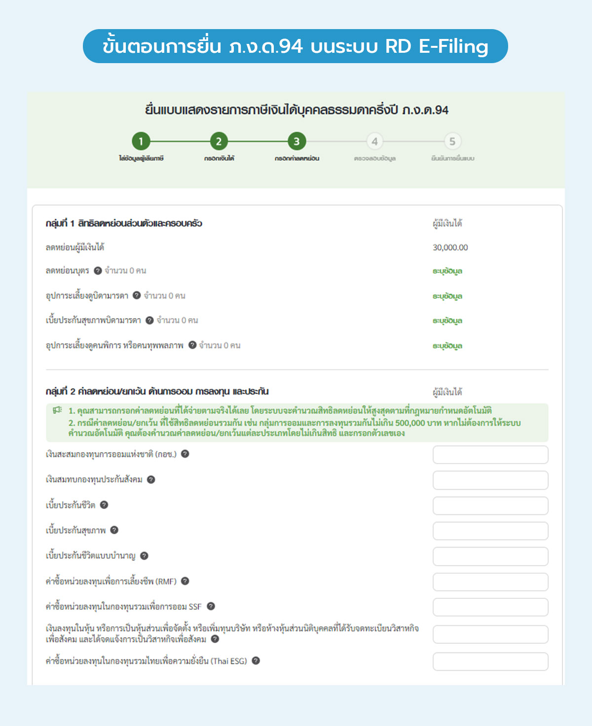 ขั้นตอนที่ 5 ค่าลดหย่อนในส่วนนี้แต่ละคนสามารถกรอกข้อมูลค่าลดหย่อนตามจริงลงไปได้เลย โดยค่าลดหย่อนจะแบ่งออกเป็น 5 กลุ่ม ไม่ว่าจะเป็น สิทธิลดหย่อนส่วนตัวและครอบครัว, ค่าลดหย่อน/ยกเว้นด้านการออม การลงทุนและประกัน, ค่าลดหย่อน/ยกเว้น จากสินทรัพย์และมาตรการนโยบายภาครัฐ, ช้อปดีมีคืน, เงินบริจาค