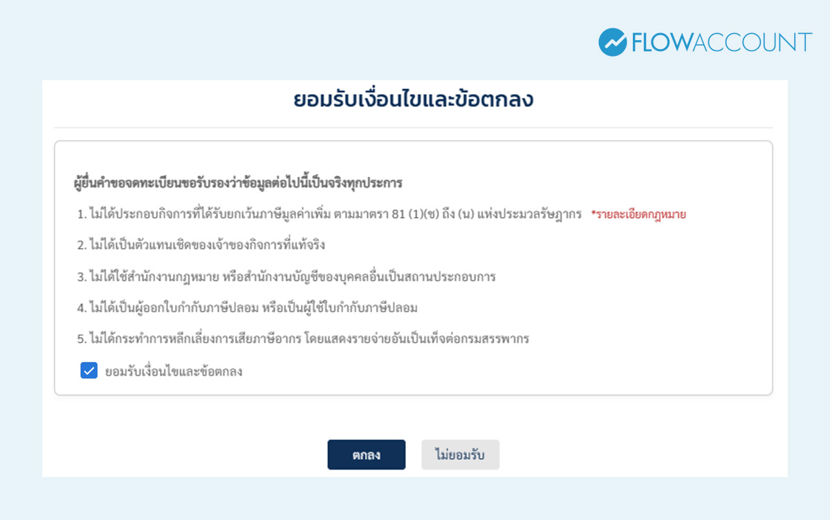 ให้ผู้ใช้อ่านทำความเข้าใจ ยอมรับเงื่อนไข และข้อตกลง จากนั้นทำเครื่องหมาย ติ๊กถูก หน้ารายการผู้ยื่นคำขอจดทะเบียนขอรับรองว่าข้อมูลต่อไปนี้เป็นจริงทุกประการ จากนั้นคลิกปุม “ยอมรับ”
