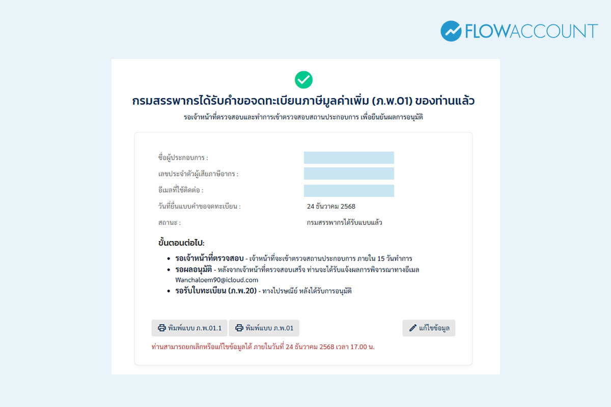 ระบบแสดงหน้าจอกรมสรรพากรได้รับแบบคำขอจดทะเบียนภาษีมูลค่าเพิ่ม (ภ.พ.01) ของท่านแล้ว