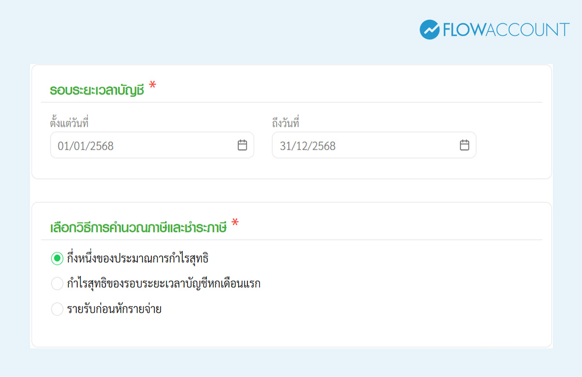 - เลือกรอบระยะเวลาบัญชี และเลือกวิธีกึ่งหนึ่งของประมาณการกำไรสุทธิ (บริษัท SMEs ต้องใช้วิธีนี้)