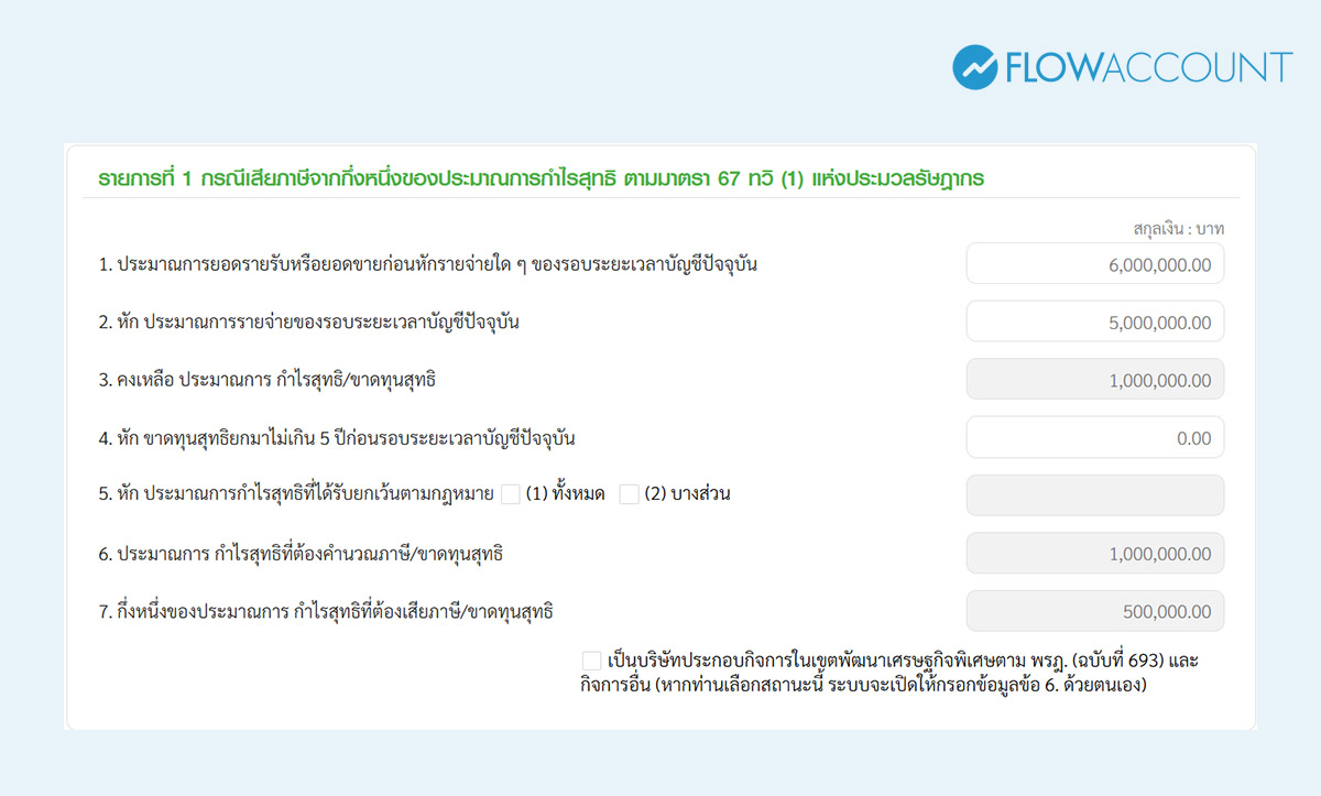- กรอกข้อมูลประมาณการรายได้ และค่าใช้จ่าย ของทั้งปีที่ประมาณการไว้ ระบบจะคำนวณกึ่งหนึ่งของประมาณการกำไรสุทธิที่ต้องเสียภาษีให้