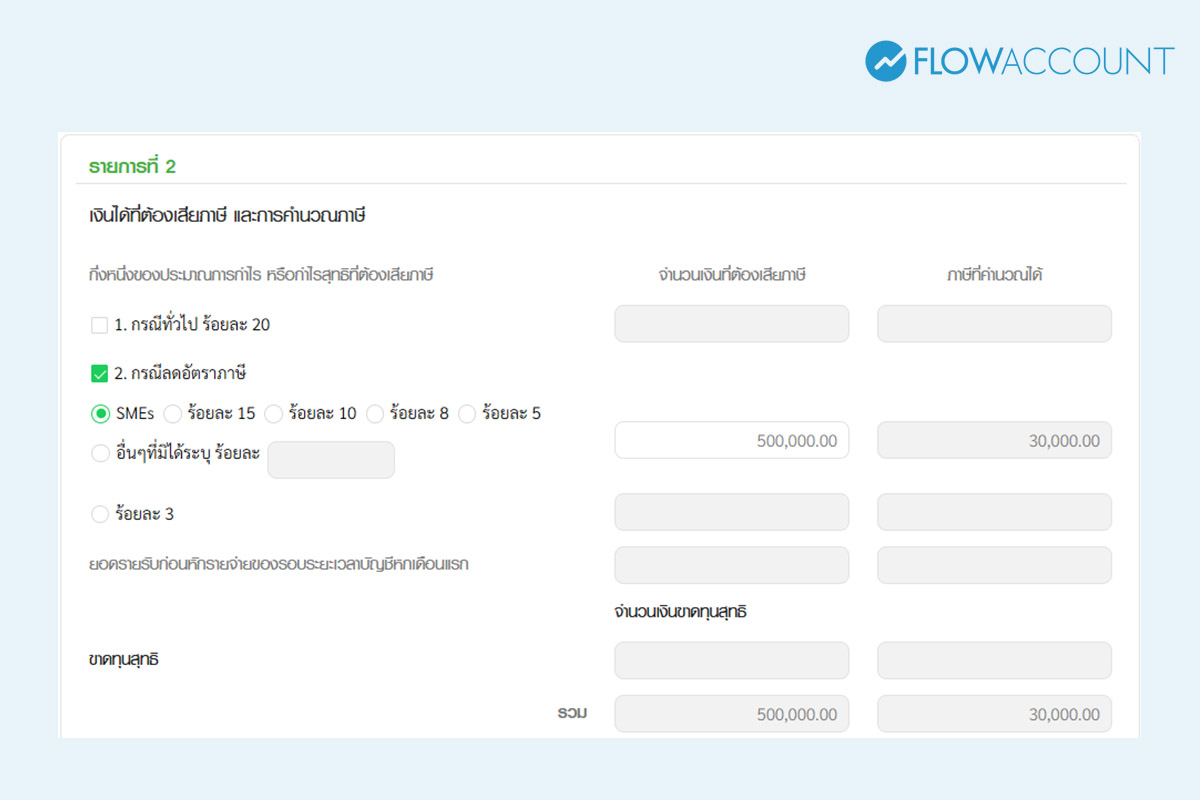 - นำกึ่งหนึ่งของประมาณการกำไรสุทธิที่ต้องเสียภาษี ไปกรอกในลำดับถัดไป ให้ตรงกับอัตราภาษีของบริษัท จากตัวอย่างนี้ เป็นธุรกิจ SMEs เลือกข้อ 2 คำนวณภาษีได้ 30,000 บาท