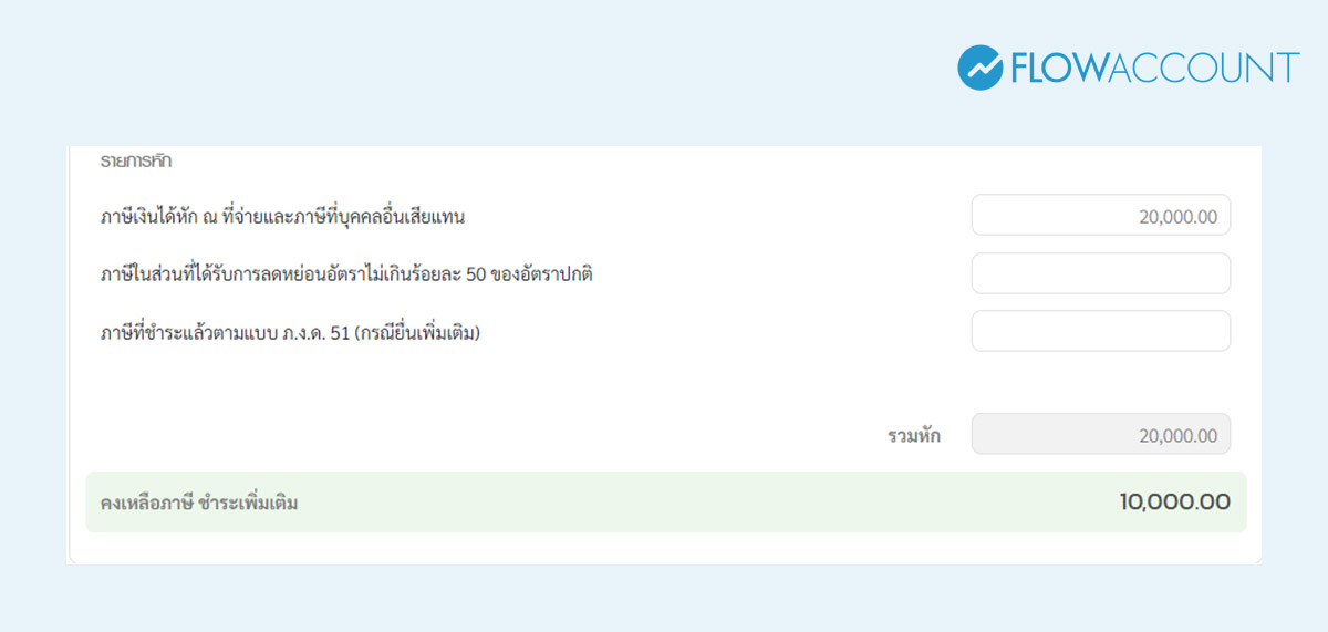 - กรอกข้อมูลภาษีเงินได้ถูกหัก ณ ที่จ่ายที่รวบรวมไว้ จากตัวอย่าง ภาษีเงินได้ถูกหัก ณ ที่จ่าย 20,000 บาท หักลบกับภาษีเงินได้ครึ่งปี จะเหลือภาษีที่ต้องชำระ 30,000 – 20,000 = 10,000 บาท