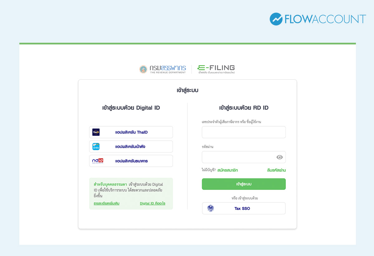 1. เข้าสู่ระบบ e-Filing: เข้าเว็บไซต์กรมสรรพากร เลือกเมนู “ยื่นแบบออนไลน์ (e-Filing)” Login ด้วย: Username / Password ของนิติบุคคล หรือ Digital ID