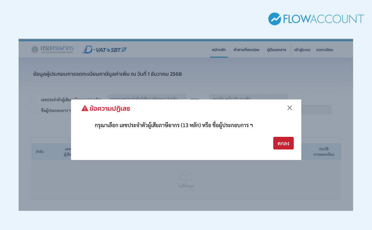 4. กรณีที่ไม่พบผู้ประกอบการจด VAT ในระบบ หน้าจอจะแสดงผลว่า “ข้อความปฏิเสธ”