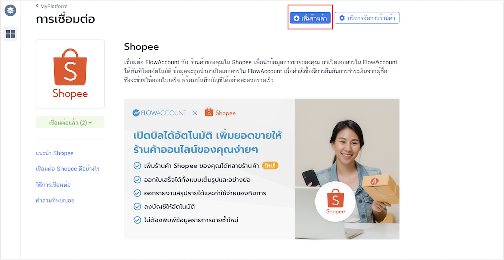 - กดที่ปุ่มเชื่อมต่อ จากนั้นระบบจะแสดงเมนูการเพิ่มร้านค้า หรือ กดปุ่มเพิ่มร้านค้าที่แสดงอยู่ที่มุมขวาของหน้าจอ