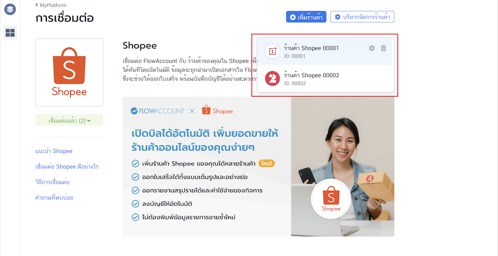 - หลังจากเพิ่มร้านค้าสำเร็จ ระบบจะแสดงจำนวนร้านค้าที่เชื่อมต่อที่ปุ่มเชื่อมต่อแล้ว