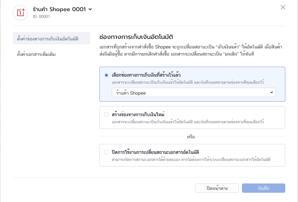- ตั้งค่าช่องทางการเก็บเงิน โดยสามารถเพิ่มช่องทางใหม่ หรือใช้ช่องทางเดิมที่มีอยู่แล้วได้ แต่หากไม่ต้องการใช้ฟีเจอร์การเปลี่ยนสถานะเก็บเงินอัตโนมัติ สามารถเลือกไม่ใช้งานฟีเจอร์ได้