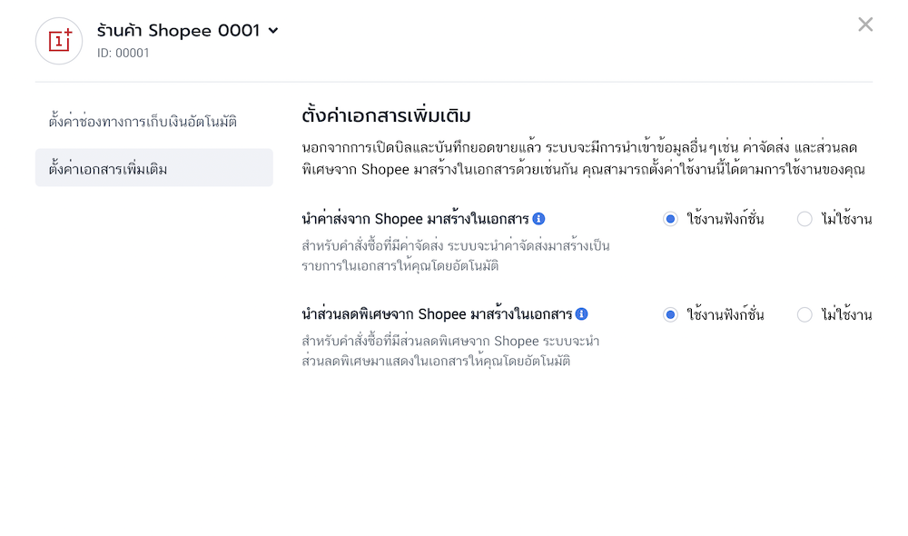 - สามารถแก้ไขการตั้งค่าร้านค้าได้โดยกดที่ปุ่มบริหารจัดการร้านค้า โดยระบบจะแสดง dropdown ที่มีข้อมูลชื่อร้าน และ ไอดีของร้านค้า