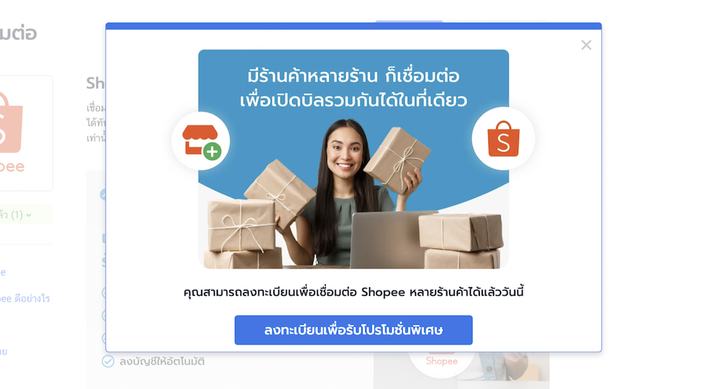 - ระบบจะแสดงหน้าต่างสำหรับการลงทะเบียนใช้งาน Multishop ขึ้นมา จากนั้นให้ผู้ใช้งานทำการคลิ๊ก “ลงทะเบียนเพื่อรับส่วนลดพิเศษ”