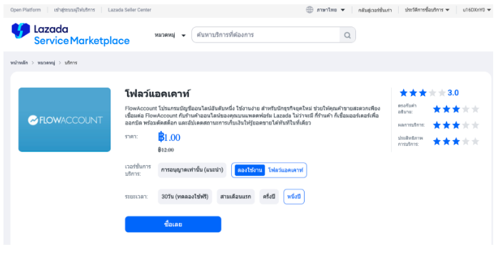 - ระบบจะนำมาที่หน้า Lazada Service Marketplace เพื่อให้เรากดอนุญาตใช้งานก่อน โดยให้กด “ลองใช้งาน FlowAccount” ระยะเวลา “หนึ่งปี” จากนั้นกด "อนุญาตให้ใช้"