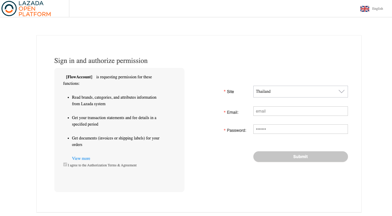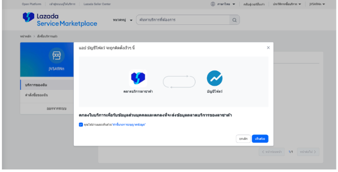 เนื่องจาก Lazada ได้มีการปรับเปลี่ยนนโยบายใหม่ การเชื่อมต่อหรือยืนยันตัวตน (Authentication) ของผู้ใช้งานบน FlowAccount ในหน้า MyPlatform Lazada จำเป็นต้องดำเนินการผ่าน Lazada Service Marketplace เท่านั้น โดยมีขั้นตอนดังนี้