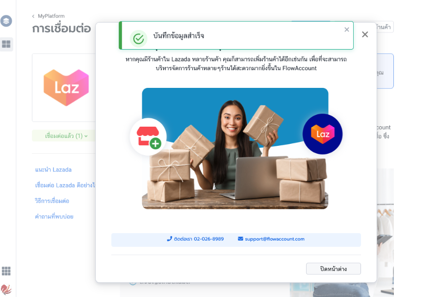- เมื่อดำเนินการทุกขั้นตอนเสร็จสิ้น ระบบจะนำคุณกลับมาที่ FlowAccount โดยสังเกต “เชื่อมต่อแล้ว” ทางด้านซ้ายมือ เพื่อเป็นการยืนยันว่าเชื่อมต่อสำเร็จแล้ว