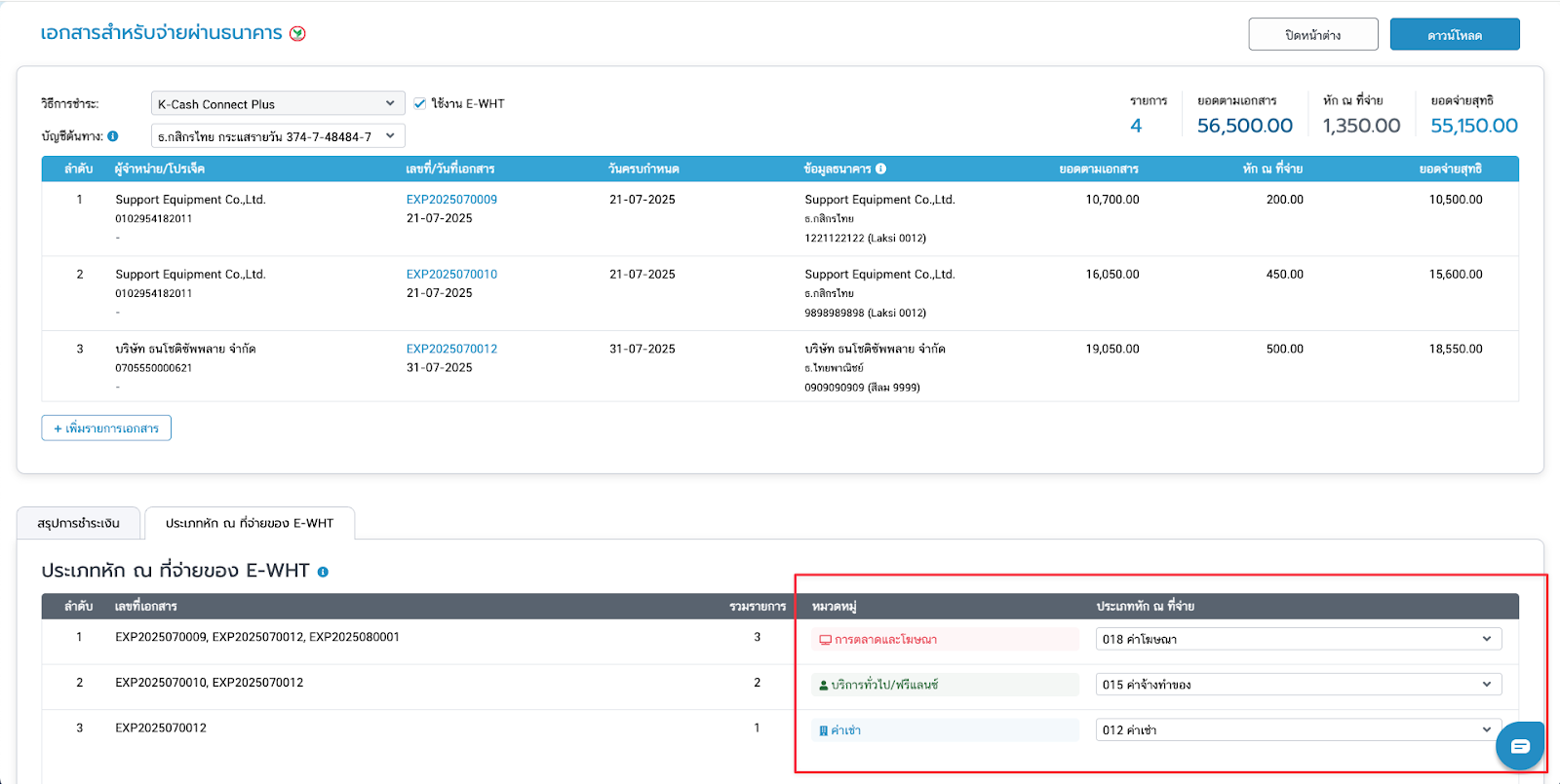 - เมื่อจับคู่ประเภทหัก ณ ที่จ่ายเรียบร้อยแล้ว สามารถคลิกดาวน์โหลดไฟล์เพื่อใช้นำเข้าแอปพลิเคชัน K Cash Connect Plus และชำระเงินให้กับผู้จำหน่ายผ่านแอปพลิเคชันของธนาคารได้ทันที