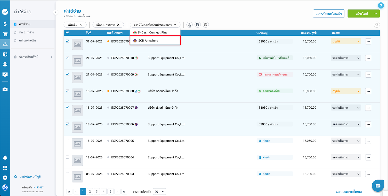 - เลือกบัญชีต้นทางที่ต้องการใช้จ่ายเงิน ซึ่งเป็นบัญชีที่สมัคร SCB Anywhere ของบริษัท