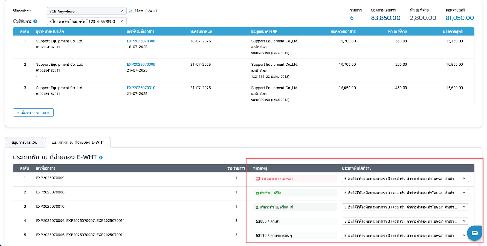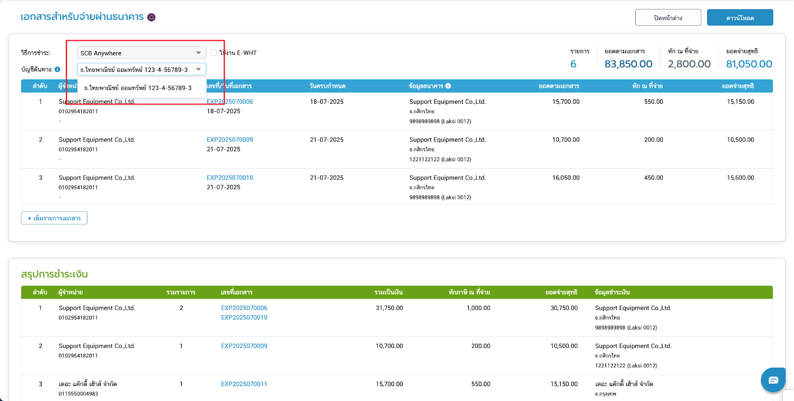 - เมื่อจับคู่ประเภทหัก ณ ที่จ่ายเรียบร้อยแล้ว สามารถคลิกดาวน์โหลดไฟล์เพื่อใช้นำเข้าแอปพลิเคชัน SCB Anywhere และชำระเงินให้กับผู้จำหน่ายผ่านแอปพลิเคชันของธนาคารได้ทันที