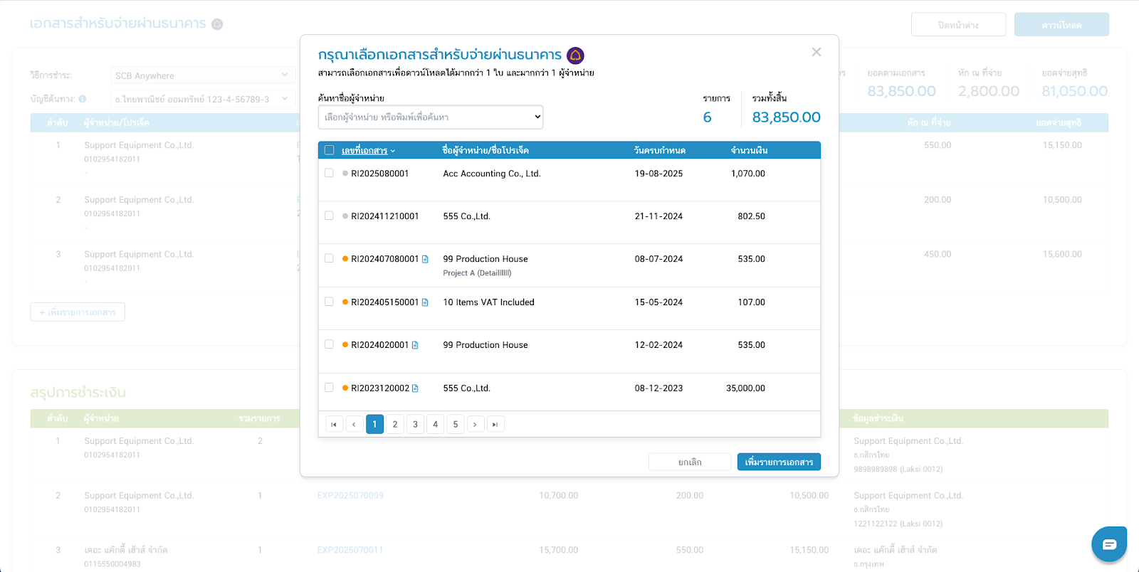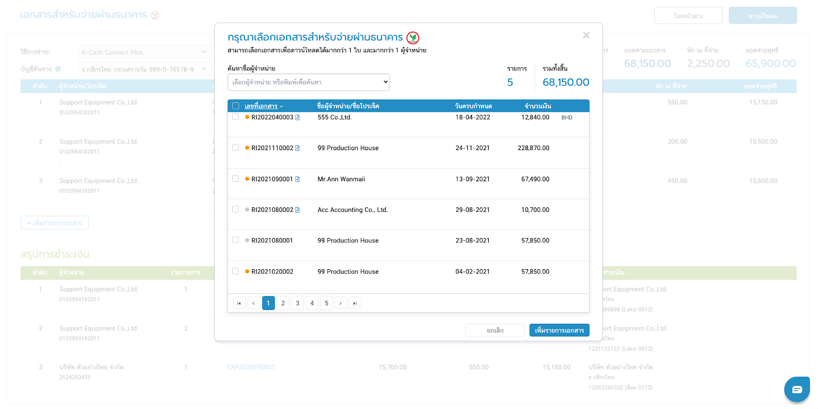 - ระบบจะสรุปเอกสารที่เลือกเพื่อเตรียมจ่าย รวมถึงยอดรวมในการจ่ายเงินให้ในตารางสีฟ้า และหากมีเอกสารที่ต้องจ่ายผู้จำหน่ายคนเดียวกัน ระบบจะรวมยอดให้ในตารางสีเขียว