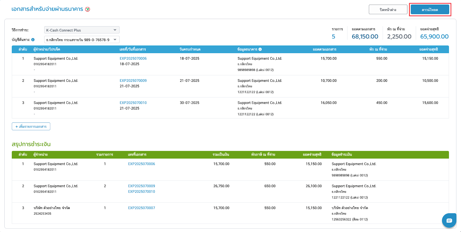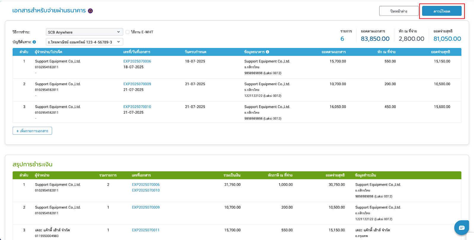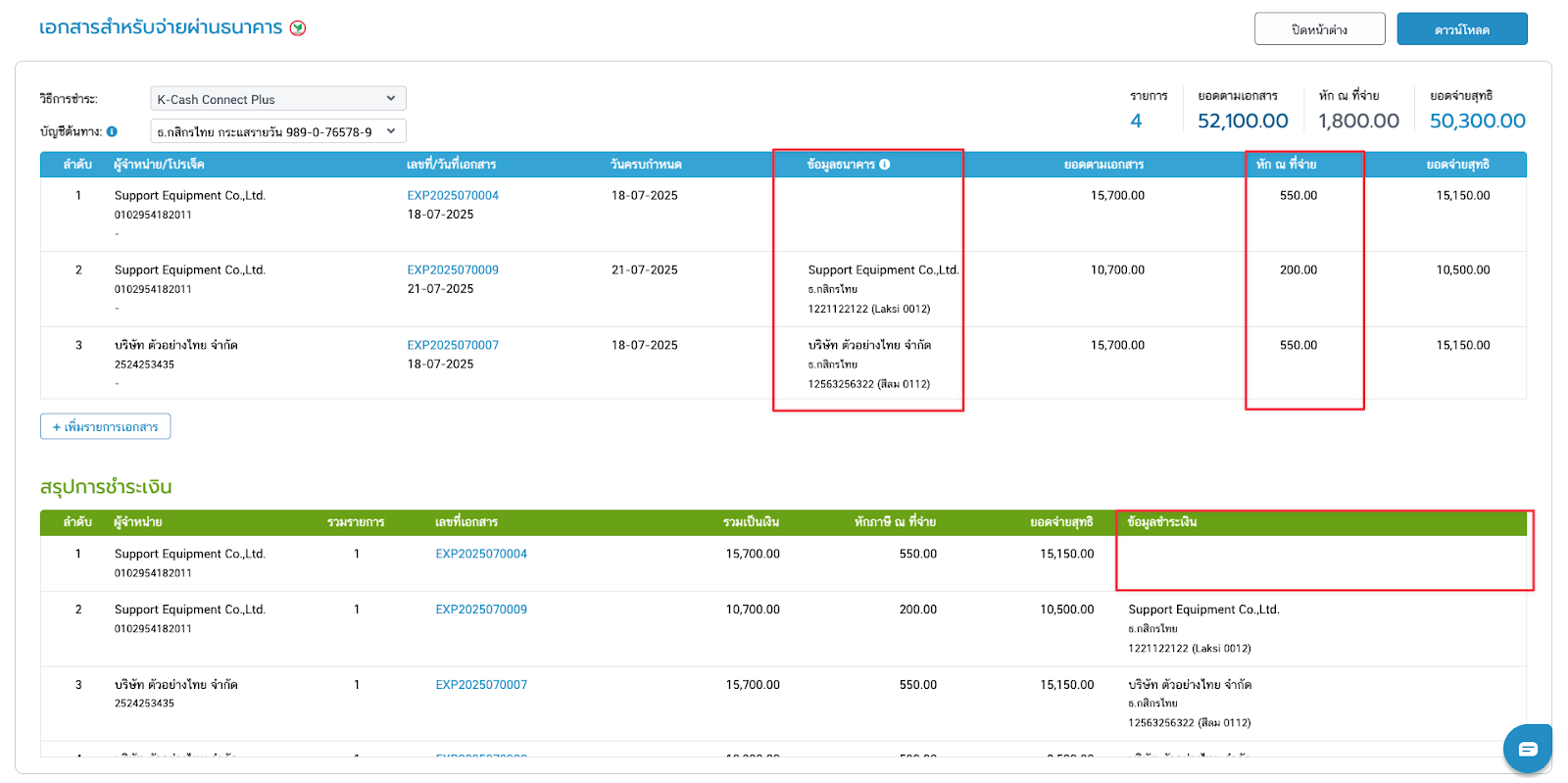 - ถ้าผู้จำหน่ายมีข้อมูลไม่ตรงกัน เช่น บัญชีธนาคาร, ที่อยู่บริษัท ระบบจะแยกสรุปยอดรวมให้ในตารางสีเขียว โดยจะมีข้อความแจ้งเตือนแต่ยังสามารถดาวน์โหลดไฟล์เพื่อนำไปใช้งานต่อได้