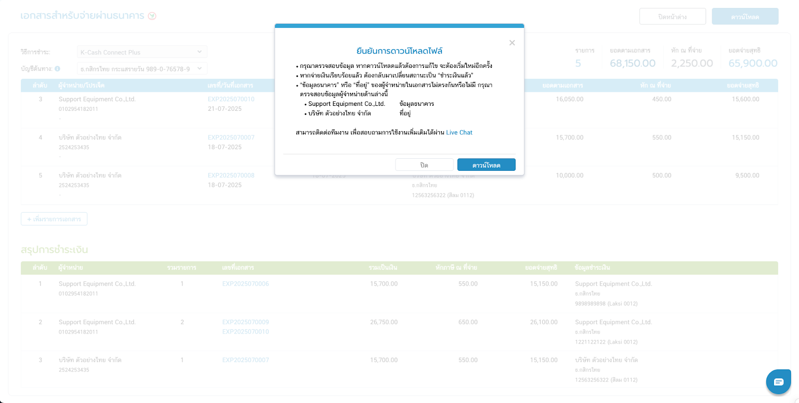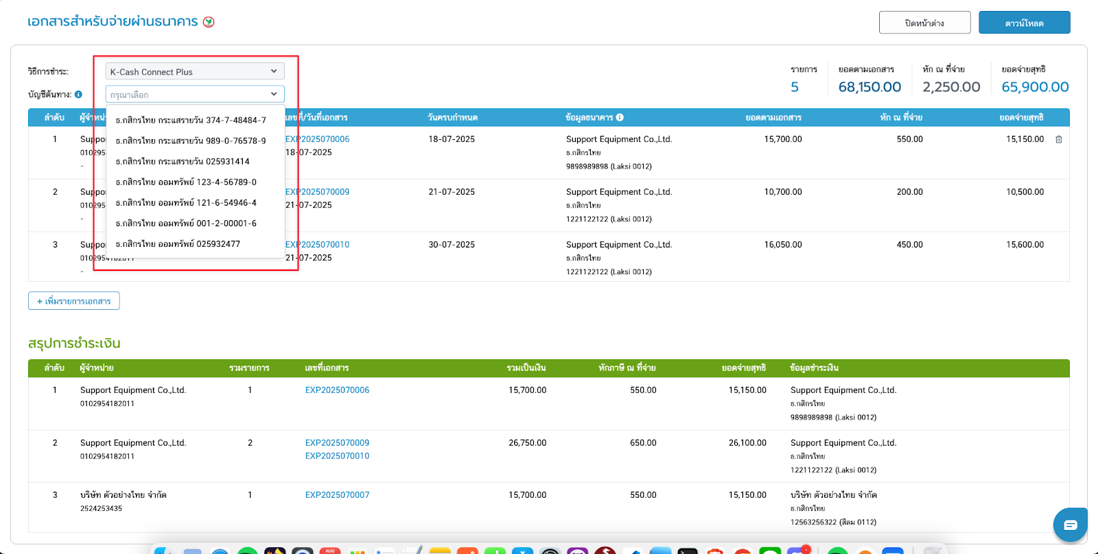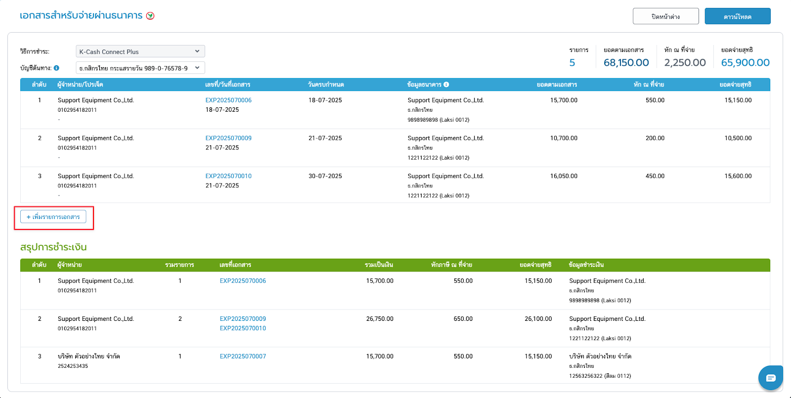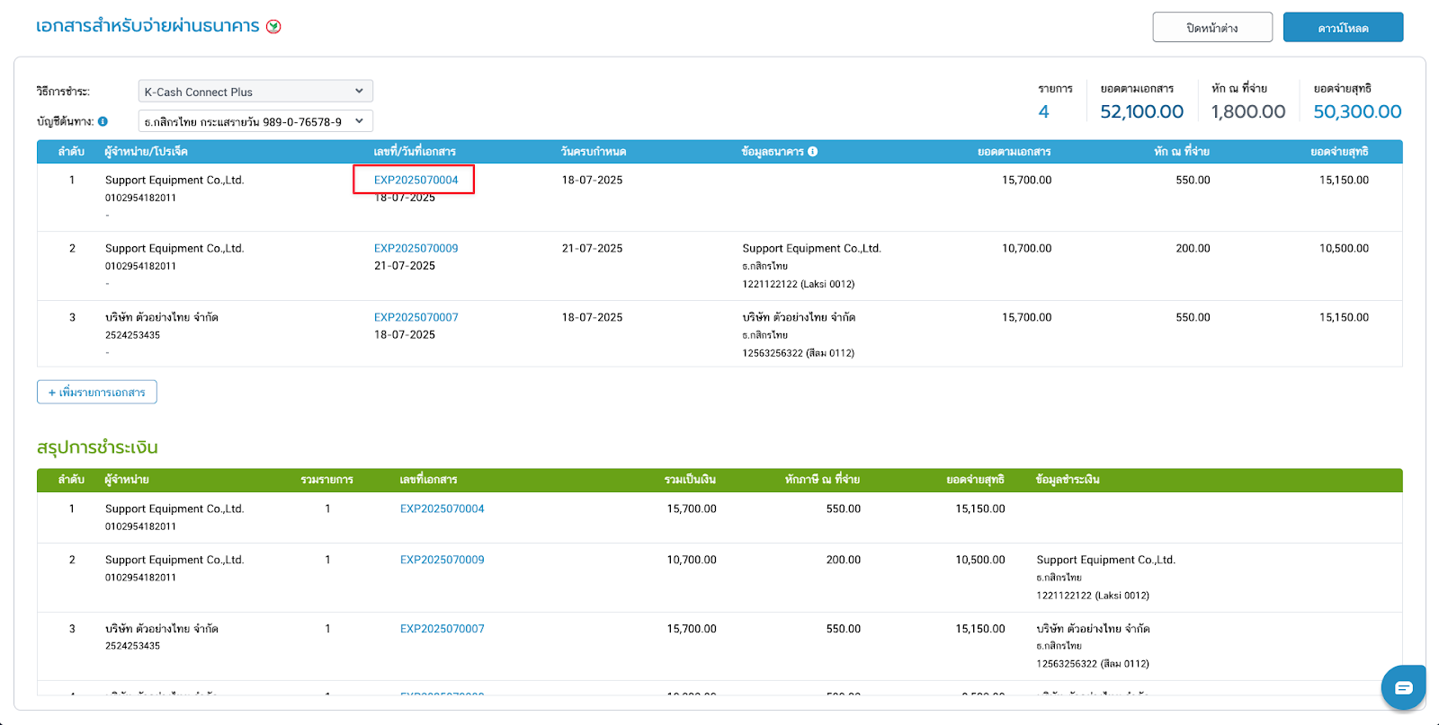 - ถ้าผู้จำหน่ายมีข้อมูลไม่ตรงกัน เช่น บัญชีธนาคาร, ที่อยู่บริษัท ระบบจะแยกสรุปยอดรวมให้ในตารางสีเขียว โดยจะมีข้อความแจ้งเตือนแต่ยังสามารถดาวน์โหลดไฟล์เพื่อนำไปใช้งานต่อได้