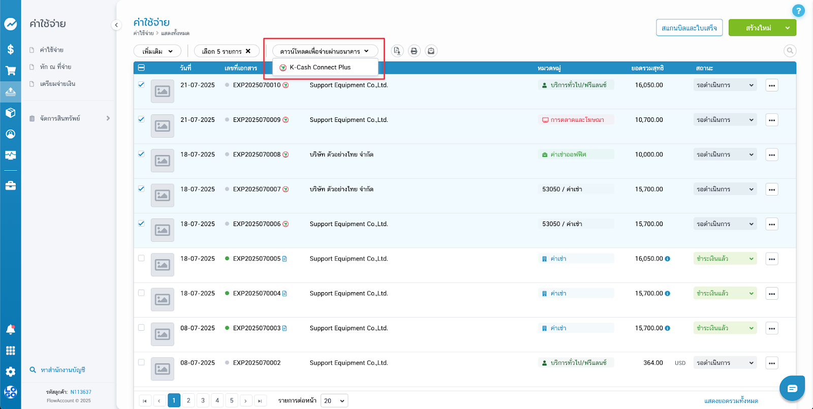 - เลือกบัญชีต้นทางที่ต้องการใช้จ่ายเงิน ซึ่งเป็นบัญชีที่สมัคร K Cash Connect Plus ของบริษัท