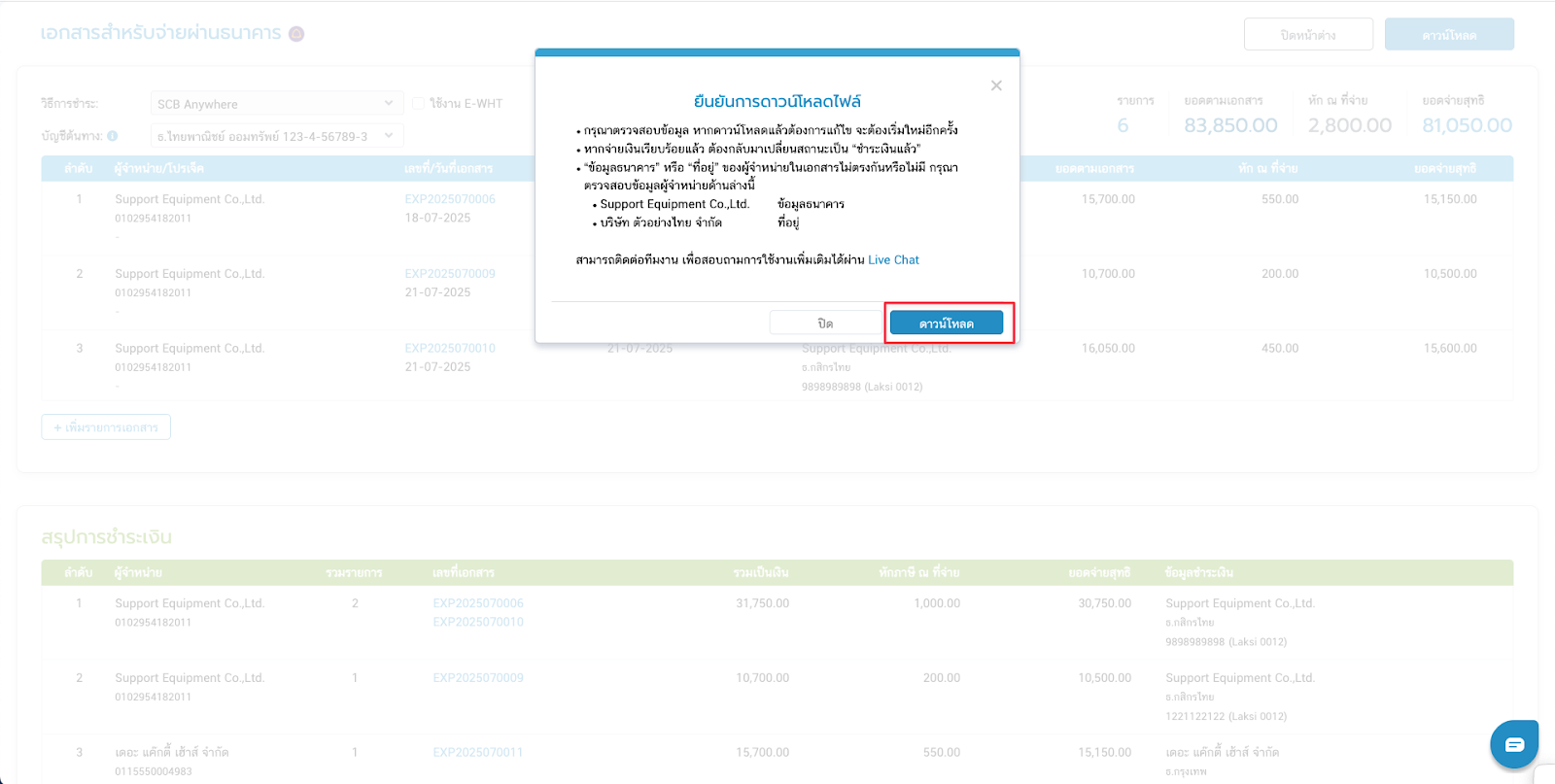 - เมื่อตรวจสอบรายการครบถ้วนแล้ว คลิกดาวน์โหลด และยืนยันการดาวน์โหลด จะได้รับไฟล์นามสกุล txt เพื่อใช้นำเข้าแอปพลิเคชัน SCB Anywhere และชำระเงินให้กับผู้จำหน่ายผ่านแอปพลิเคชันของธนาคารได้ทันที