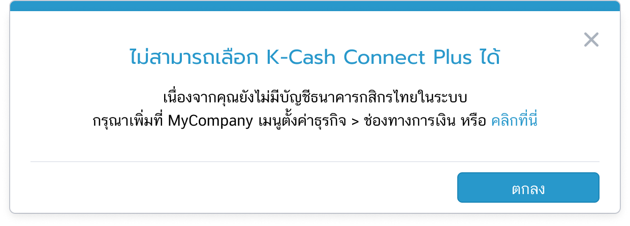 - ในกรณีที่ยังไม่ได้เพิ่มบัญชีเงินฝากธนาคารในระบบ จะไม่สามารถเลือกไฟล์ดาวน์โหลดได้ ต้องทำการเพิ่มบัญชีธนาคารก่อน ซึ่งทำได้ที่ MyCompany เลือกเพิ่มช่องทางการเงิน หรือคลิกที่ Pop up แจ้งเตือนเพื่อไปหน้าเพิ่มบัญชีธนาคาร
