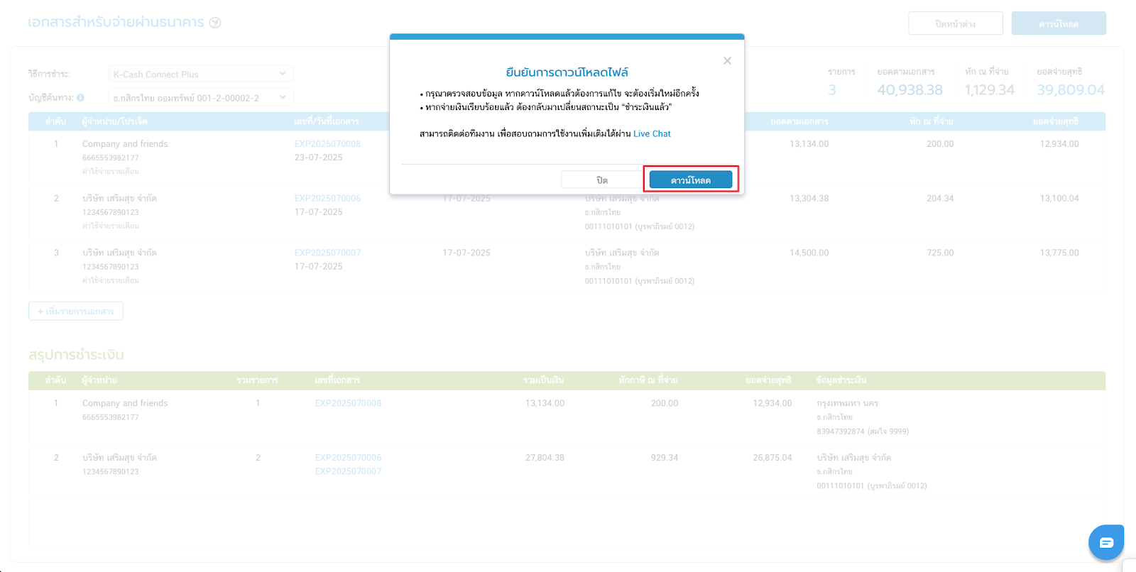 - เมื่อตรวจสอบรายการครบถ้วนแล้ว คลิกดาวน์โหลด และยืนยันการดาวน์โหลด จะได้รับไฟล์นามสกุล txt เพื่อใช้นำเข้าแอปพลิเคชัน K Cash Connect Plus และชำระเงินให้กับผู้จำหน่ายผ่านแอปพลิเคชันของธนาคารได้ทันที