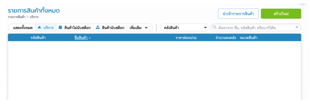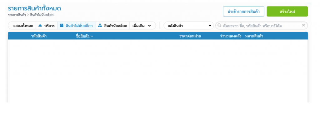 จะไม่มีทางแสดงในคลังอื่นๆ จะเห็นก็ต่อเมื่อเลือก Filter เป็น คลังทั้งหมดเท่านั้น เนื่องจาก สินค้าประเภท ‘บริการและสินค้าไม่นับสต็อก’ ไม่มีจำนวนสต็อก จีงไม่เจอในคลังสินค้าใดๆเลย