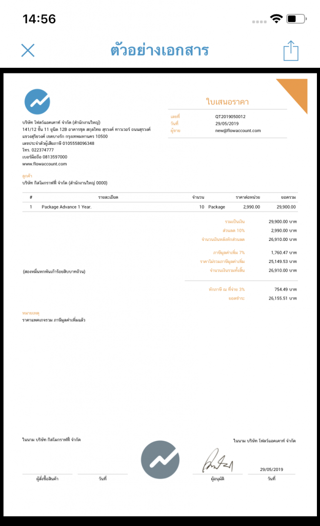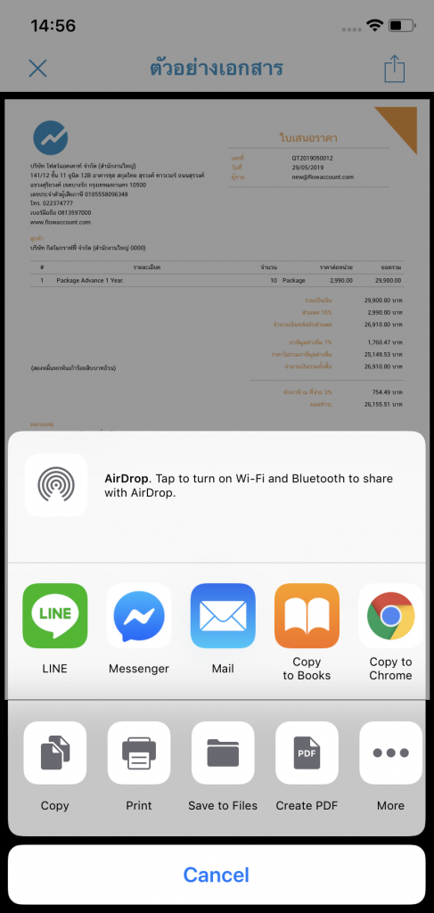 ระบบจะแสดงตัวอย่างเอกสารที่เลือก และสามารถส่งเอกสารให้กับลูกค้า หรือ ผู้ติดต่อได้ โดยการกดปุ่ม แชร์เอกสาร