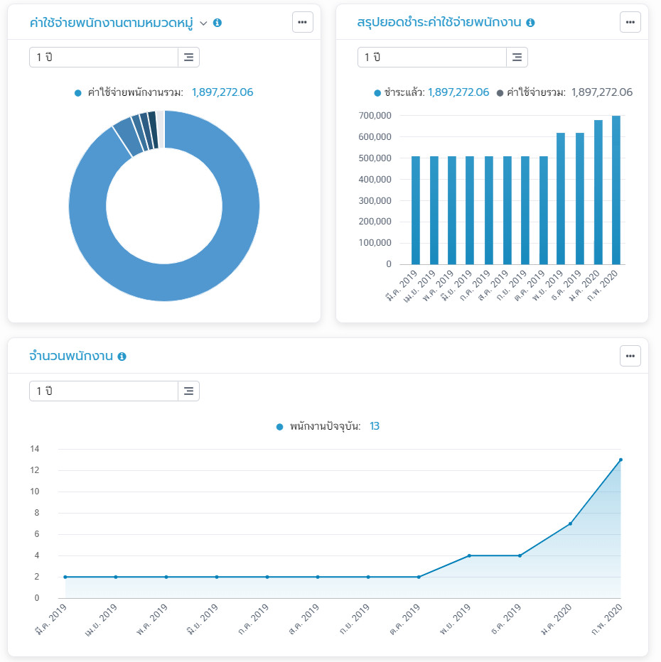 ภาพรวมเงินเดือนในระบบ FlowPayroll จะแสดงยอดค่าใช้จ่ายของพนักงานในมุมมองต่างๆ เพื่อให้เจ้าของกิจการทราบค่าใช้จ่ายเกี่ยวกับพนักงานที่เกิดขึ้นในกิจการ โดยมีทั้งหมด 3 กราฟ ดังนี้