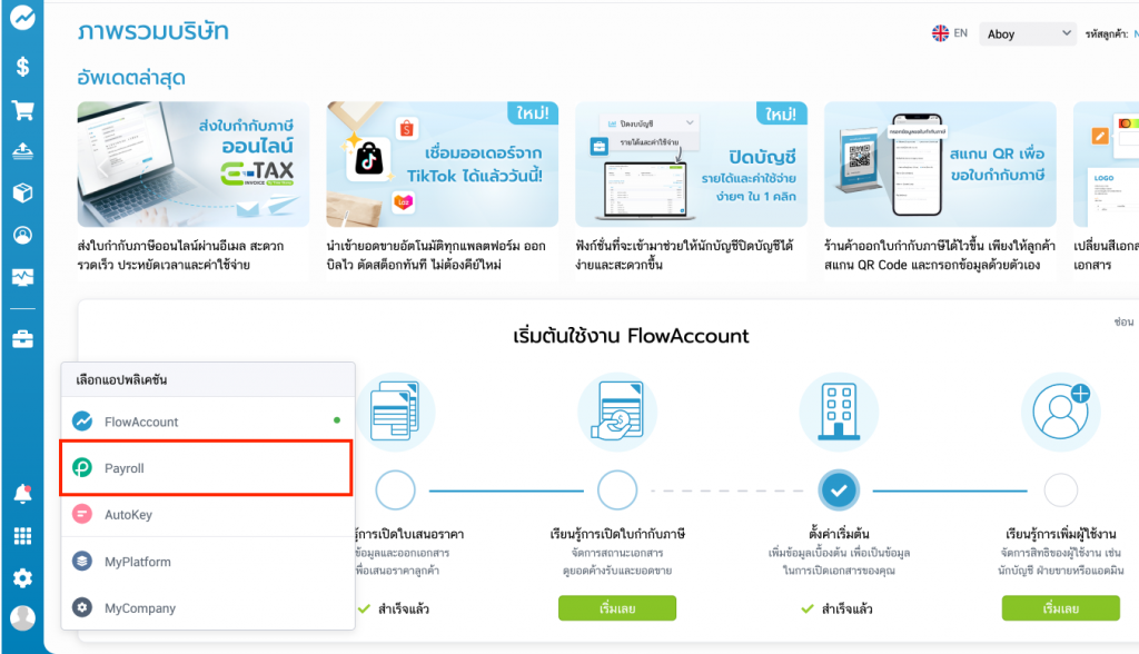 - หลังจากเข้าสู่ระบบ FlowAccount สามารถทำการเลือกที่เมนู เลือกแอปพลิเคชัน และกด Payroll เพื่อเข้าสู่ระบบเงินเดือน