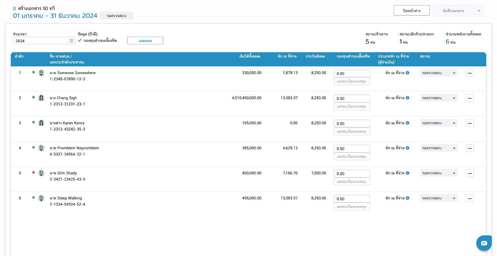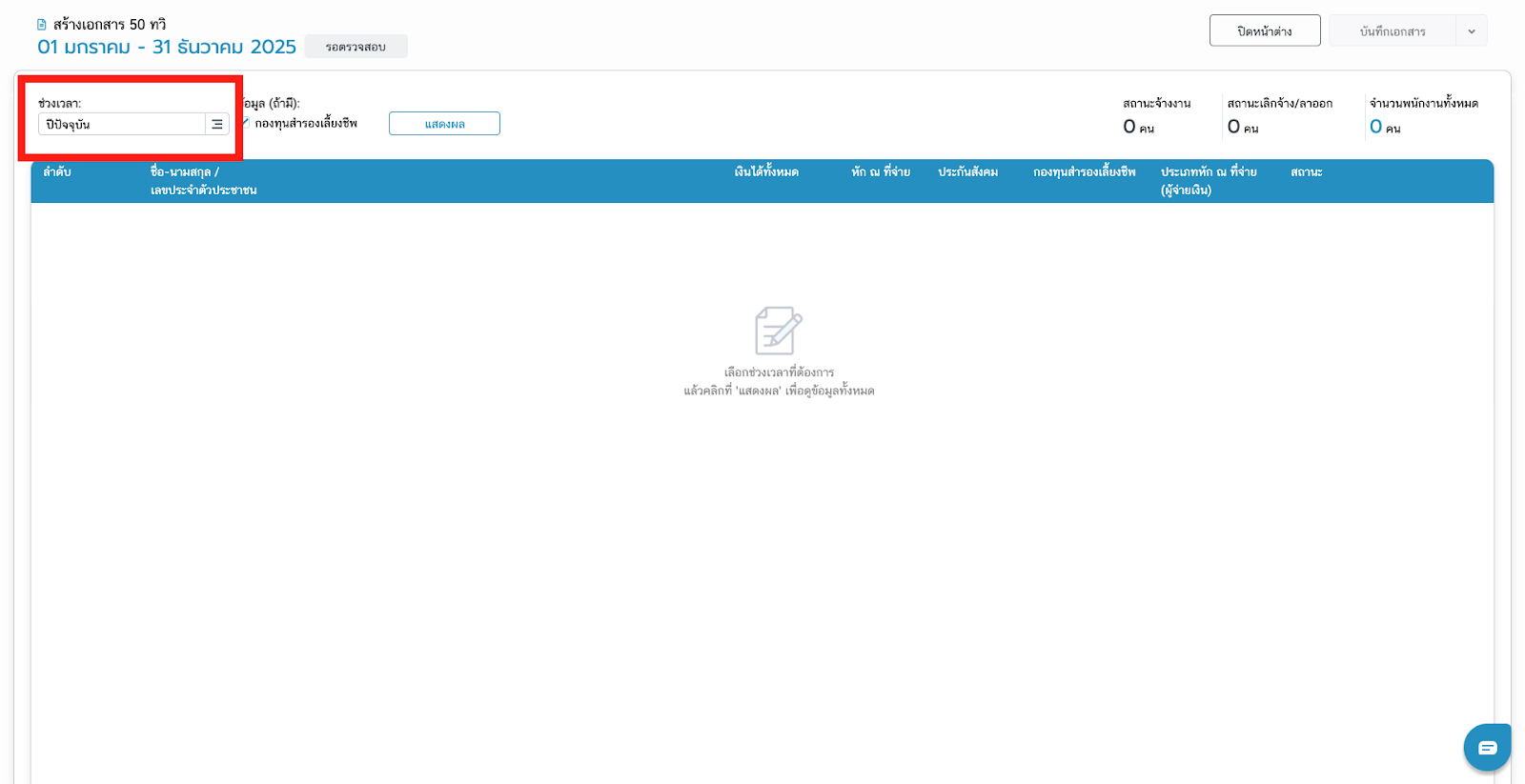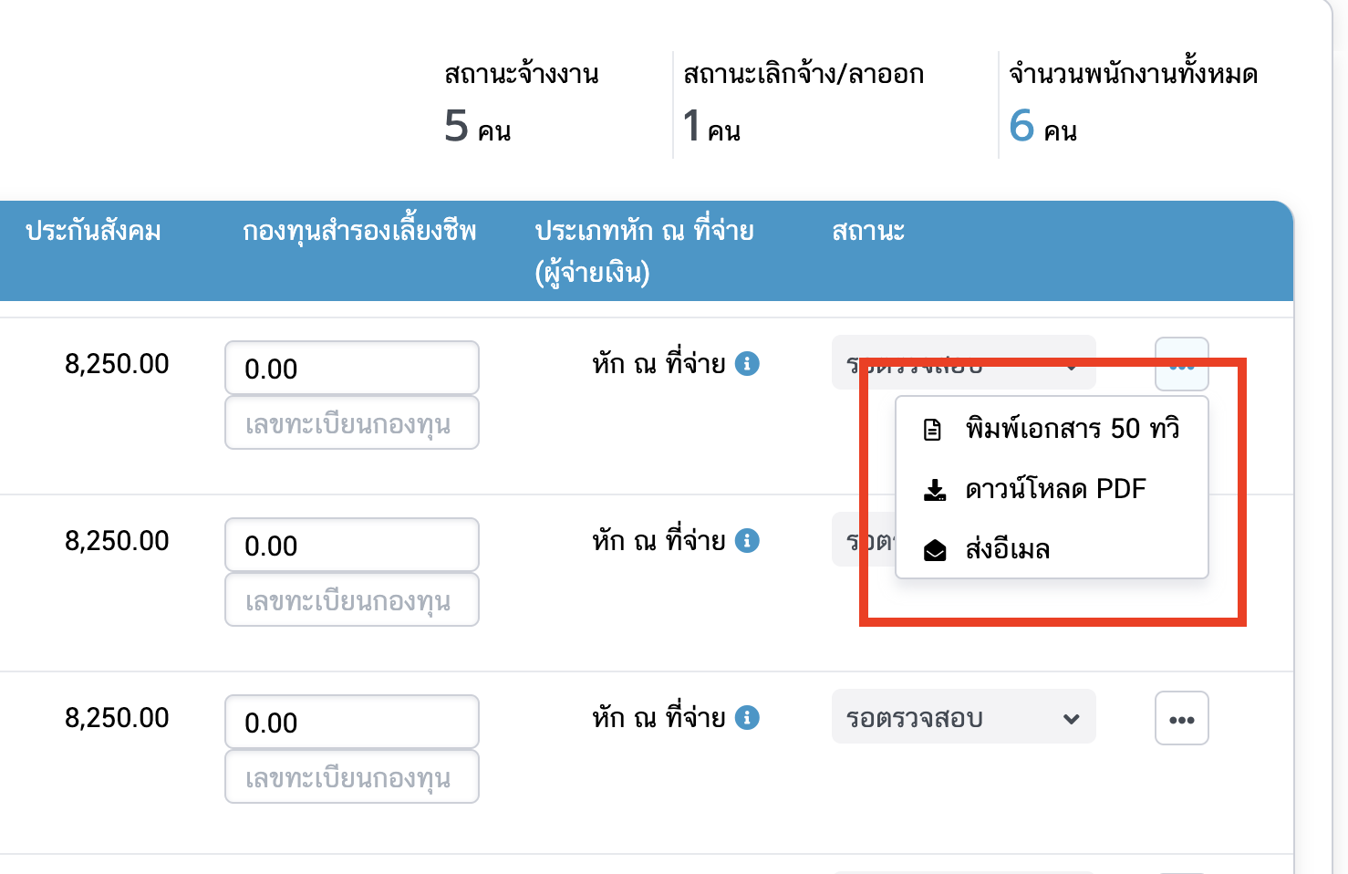 - สามารถกด พิมพ์เอกสาร50ทวิ/ดาวน์โหลด/ส่งอีเมลของพนักงาน แม้สถานะเอกสารและพนักงานจะยังเป็น "รอตรวจสอบ"