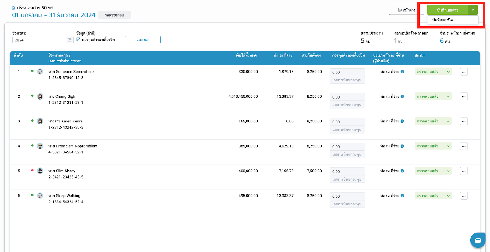 - หลังจากตรวจสอบรายการเงินเดือนทุกรายการเรียบร้อยแล้ว สามารถทำการเลือกเปลื่ยนสถานะพร้อมกันหลายรายการ โดยการกดปุ่มบันทึกและปิด