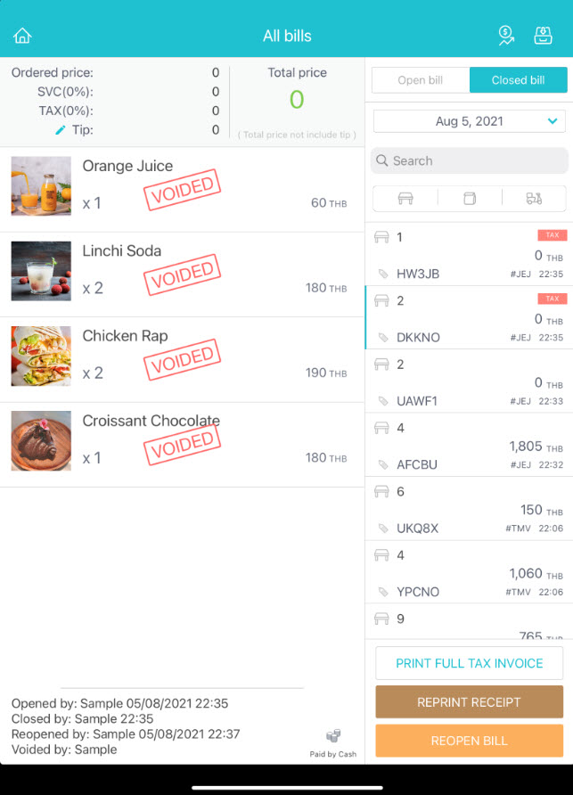 7. เมื่อคุณต้องการยกเลิก Void บิล Full TAX ใน POS FoodStory สามารถกด “Void Bill” จากนั้นกด “Ok” เพื่อยืนยัน