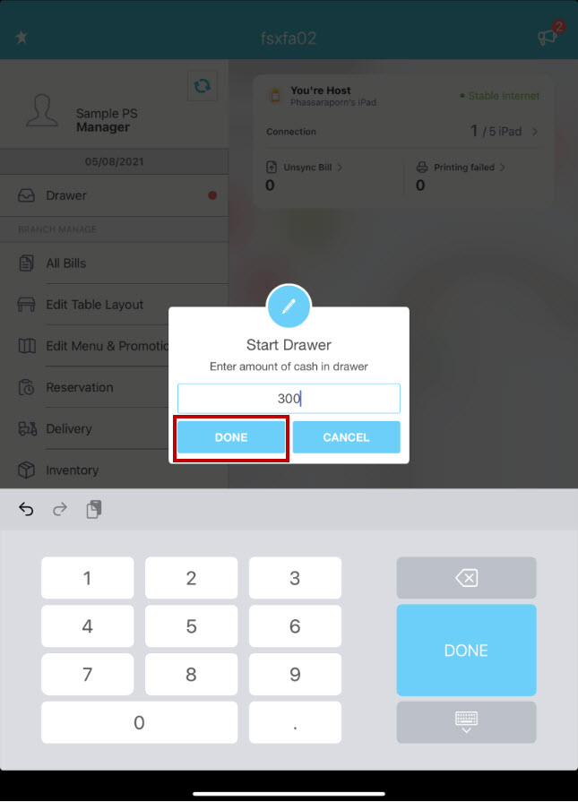 4. จะมี Pop-up ให้เติมเงินใน Drawer เพื่อเริ่มต้นใช้งาน สามารถใส่จำนวนเงินที่ต้องการและกด “Done” ได้เลย จากนั้นจะมี Pop-up แจ้งเตือน (ดังภาพ) ให้ยืนยันจำนวนเงิน สามารถกด “Ok” เพื่อเริ่มใช้งานได้เลย