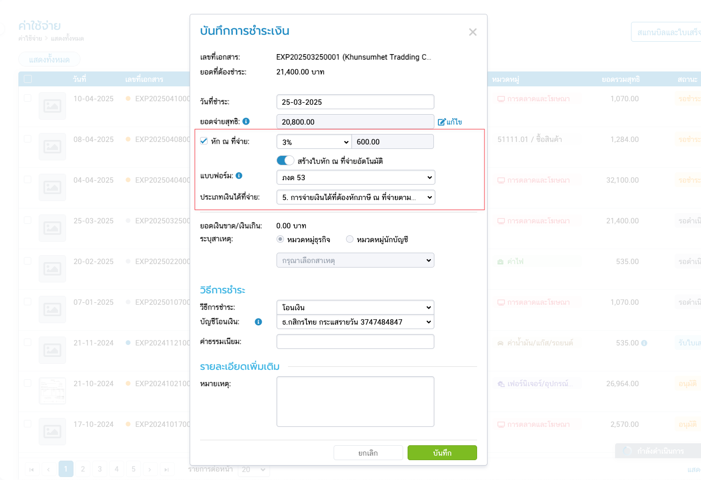 - เมื่อคลิกชำระค่าใช้จ่าย ให้คลิกเลือกหัก ณ ที่จ่ายและสร้างใบหัก ณ ที่จ่ายอัตโนมัติ