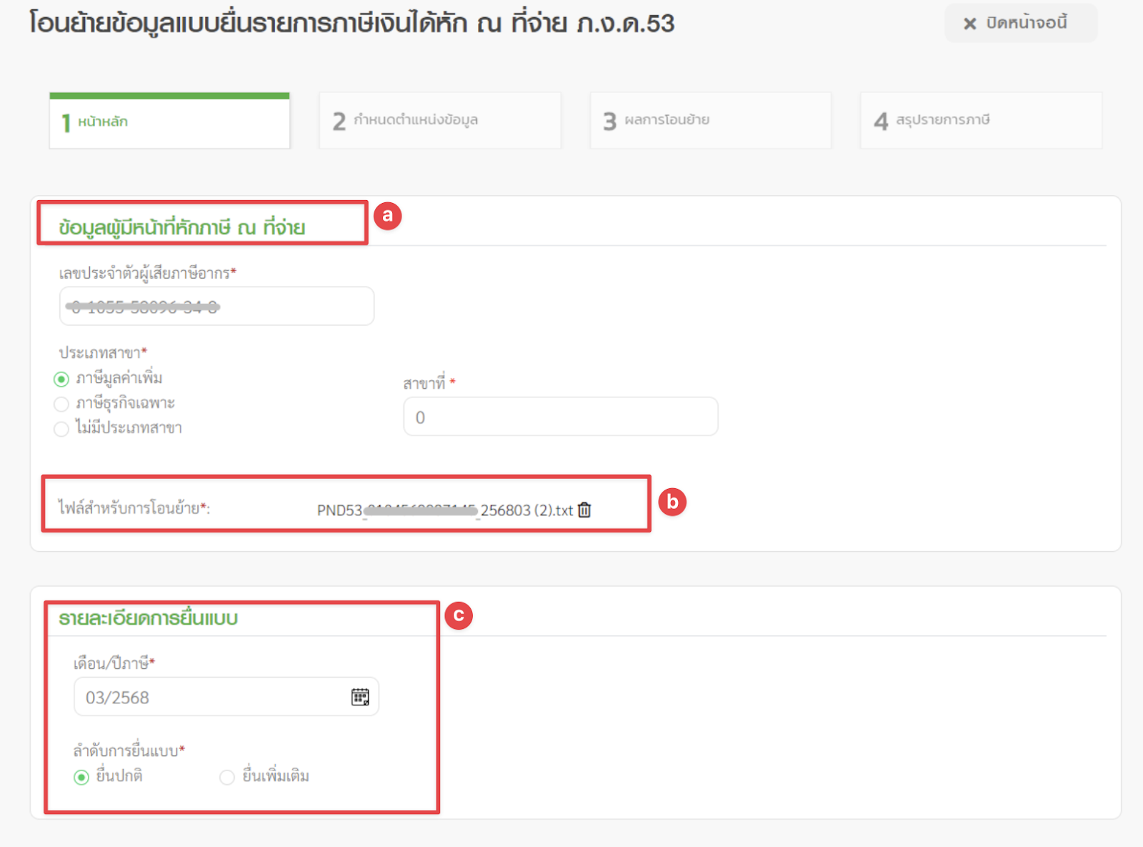 - รายละเอียดการยื่นแบบ “เดือนภาษี” และ “ยื่นปกติ หรือ ยื่นเพิ่มเติม”