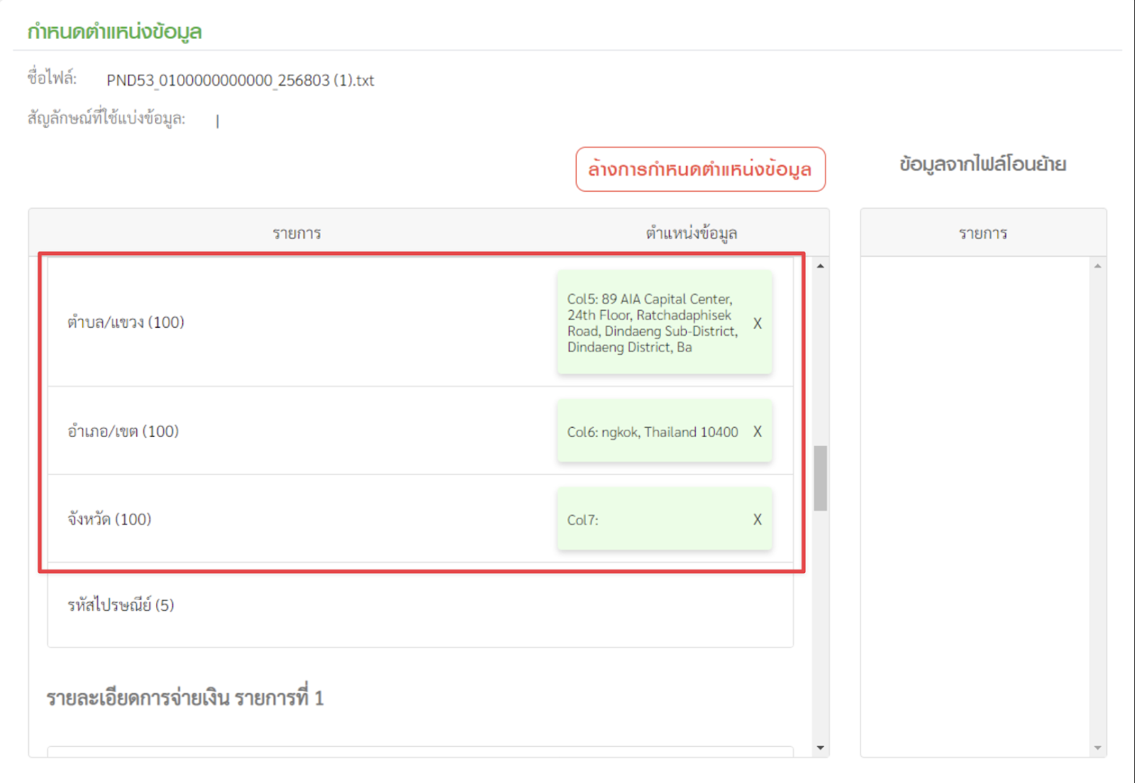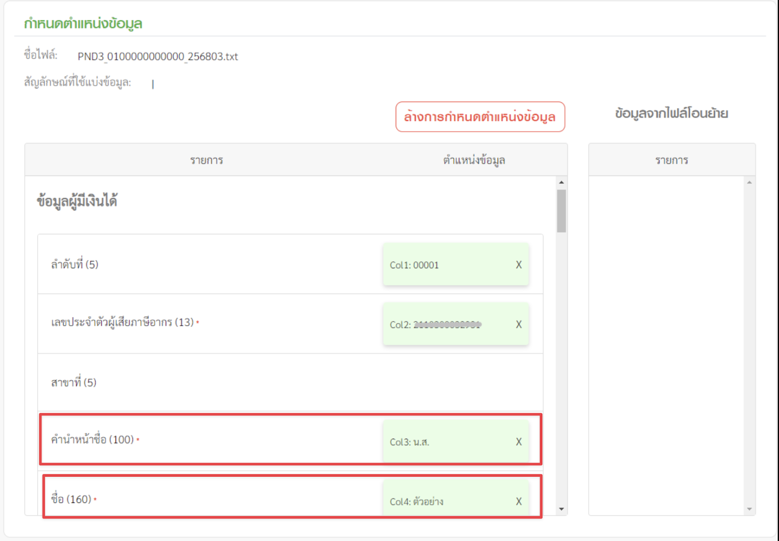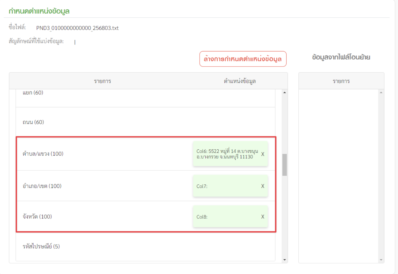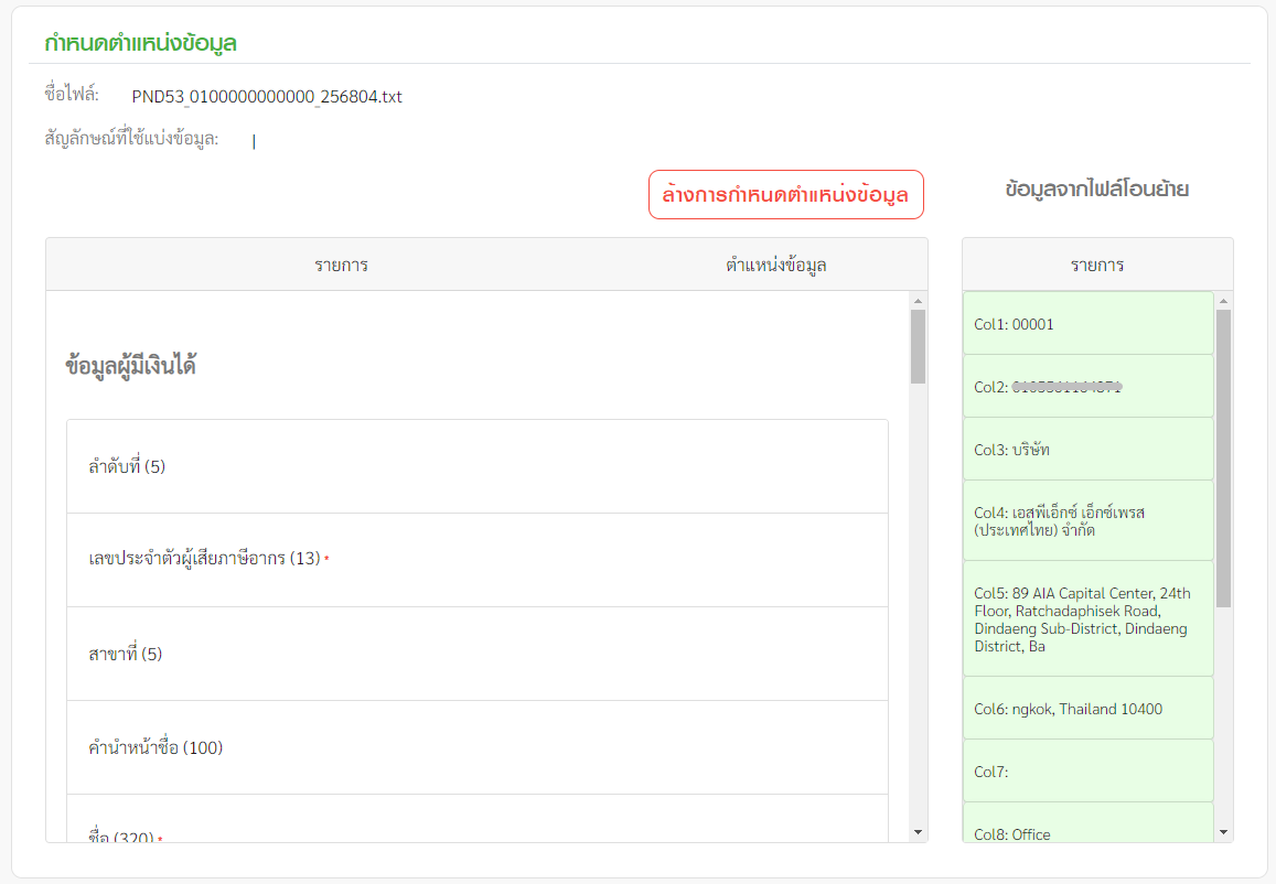 4.2 กำหนดตำแหน่งข้อมูล หน้านี้จะเป็นการกำหนดตำแหน่งของข้อมูล โดยโปรแกรมจะแสดงข้อมูลบรรทัดแรกมาให้เป็นตัวอย่าง ผู้ใช้งานสามารถลากข้อมูลด้านขวามาวางในช่องข้อมูลด้านซ้ายตามตำแหน่งที่ถูกต้องได้เลย