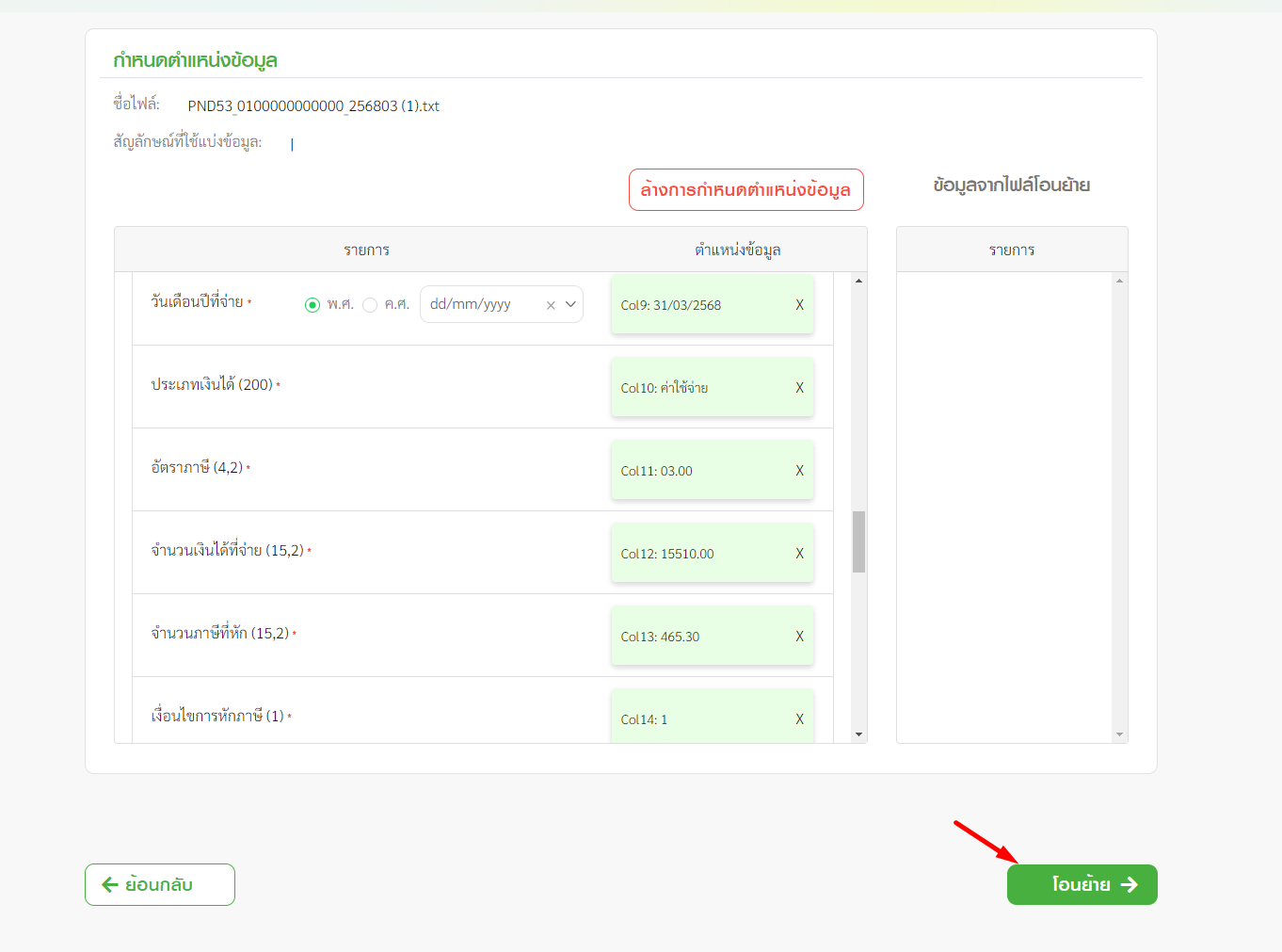 4.3 เมื่อกำหนดตำแหน่งข้อมูลเรียบร้อยแล้ว ให้คลิก “โอนย้าย”