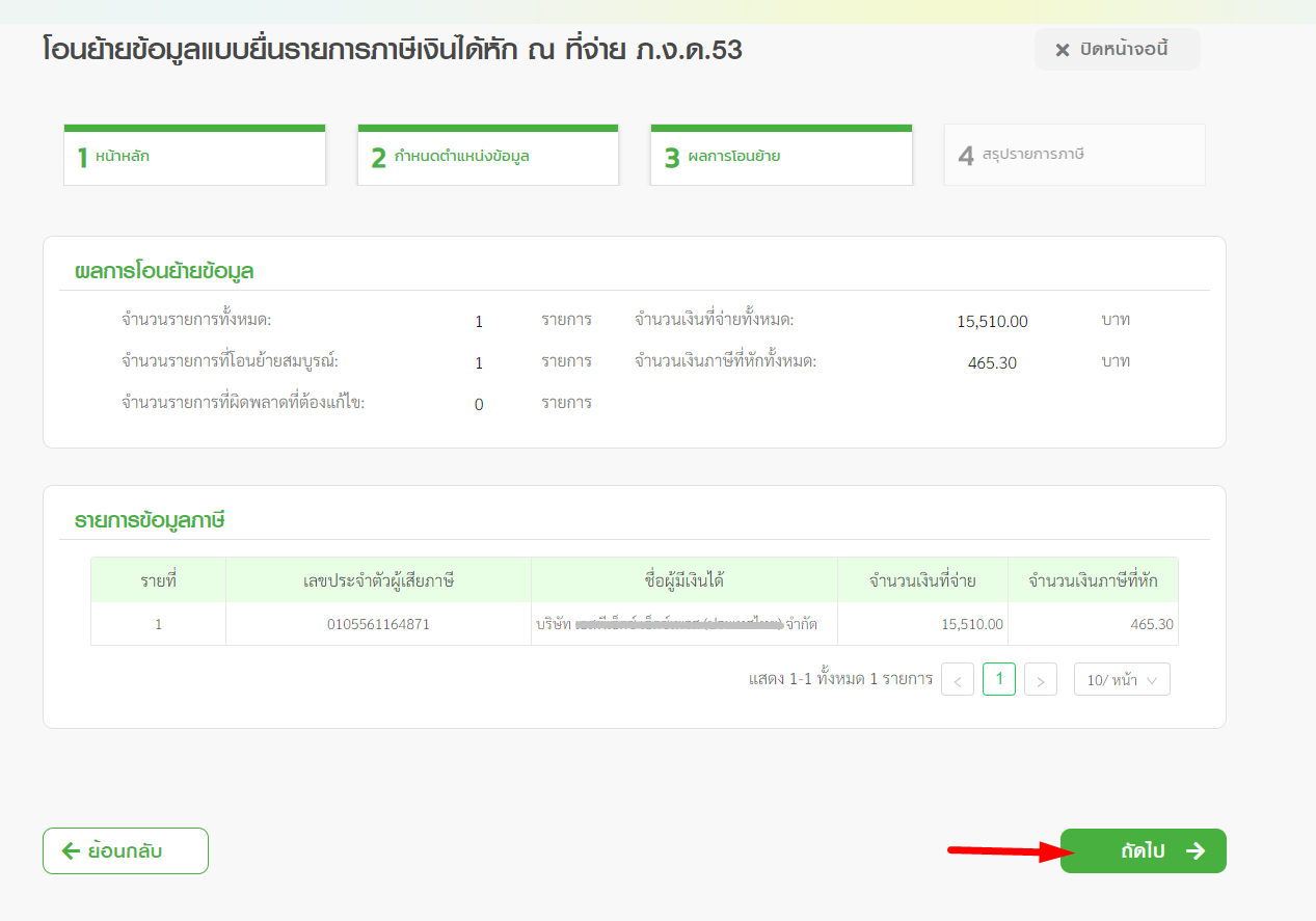 4.5 ในกรณีที่ข้อมูลโอนย้ายสำเร็จไม่มีข้อมูลใดผิดพลาด ให้คลิก “ถัดไป”