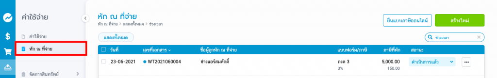 - สร้างหนังสือรับรองหัก ณ ที่จ่ายในเมนู “หัก ณ ที่จ่าย”