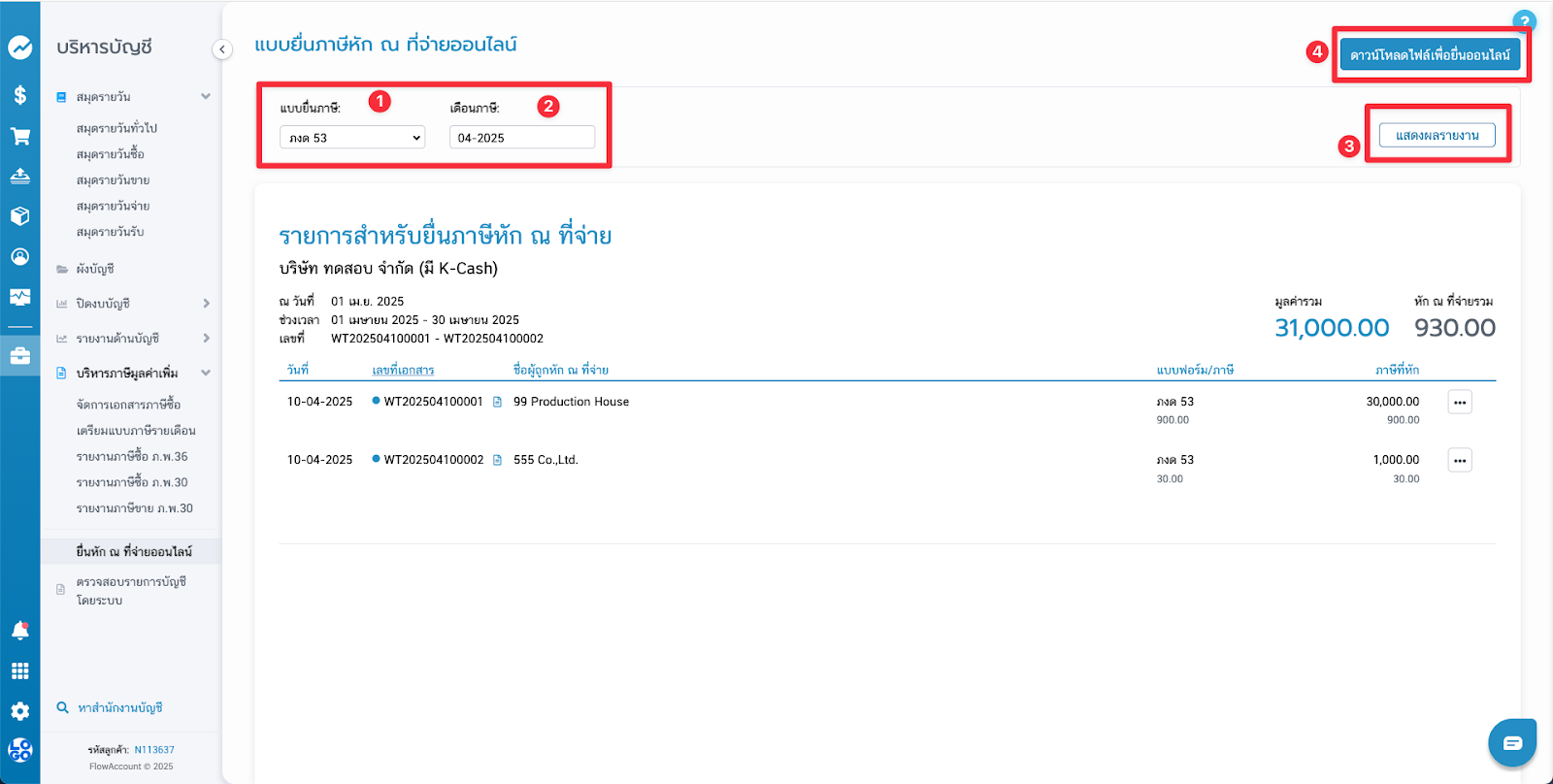 - ระบบจะแสดงรายการสำหรับยื่นภาษีหัก ณ ที่จ่ายตามแบบยื่นภาษีและเดือนภาษีที่ได้เลือกไว้