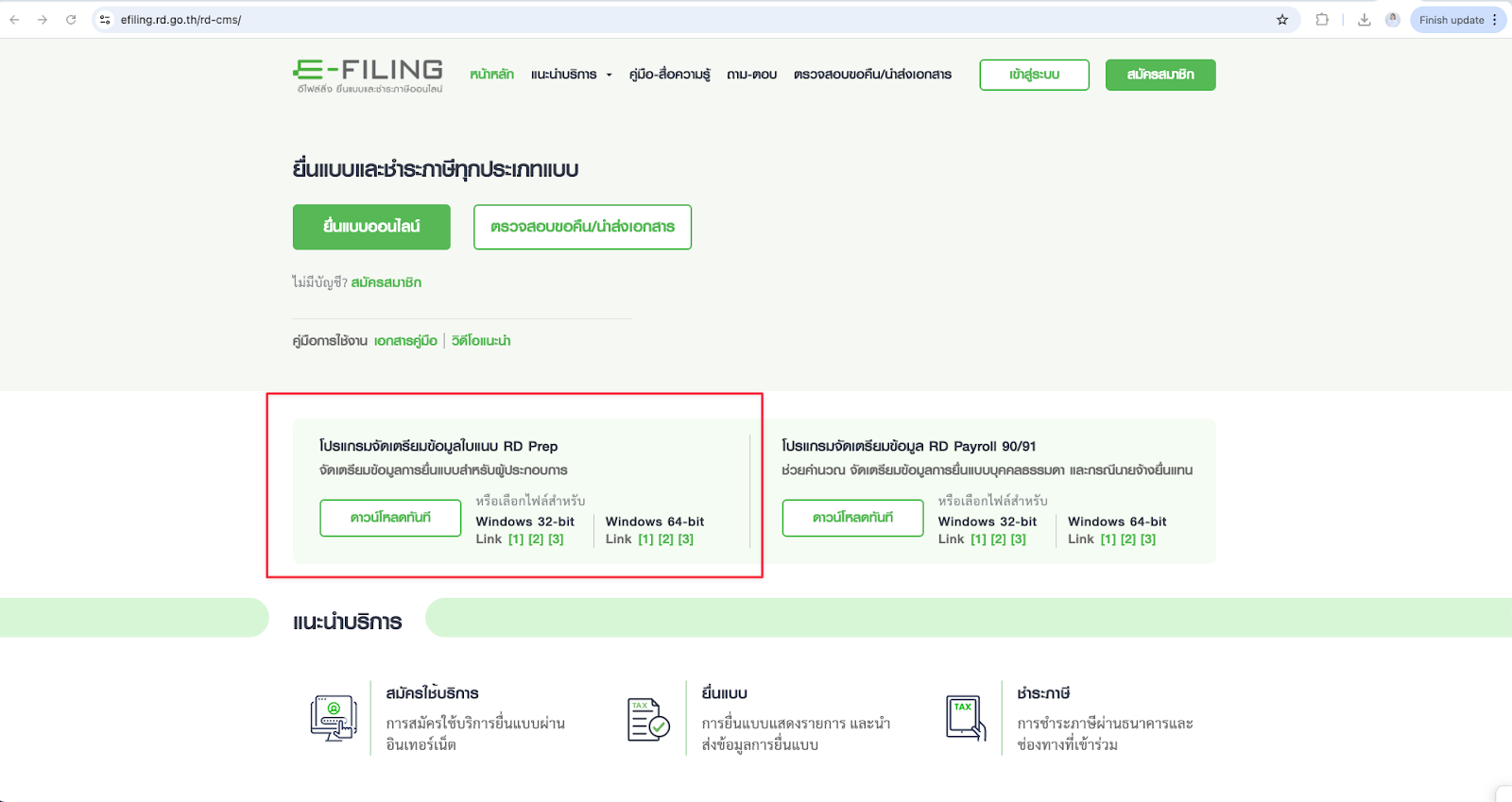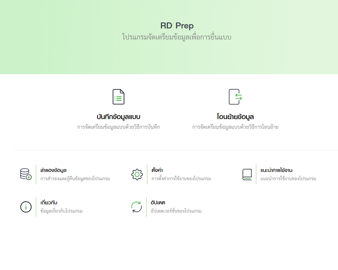หลังจากดาวโหลดและติดตั้งโปรแกรม RD Prep เสร็จเรียบร้อยแล้ว สามารถดาวน์โหลดโปรแกรมและคู่มือได้จากลิงค์ กรมสรรพากร