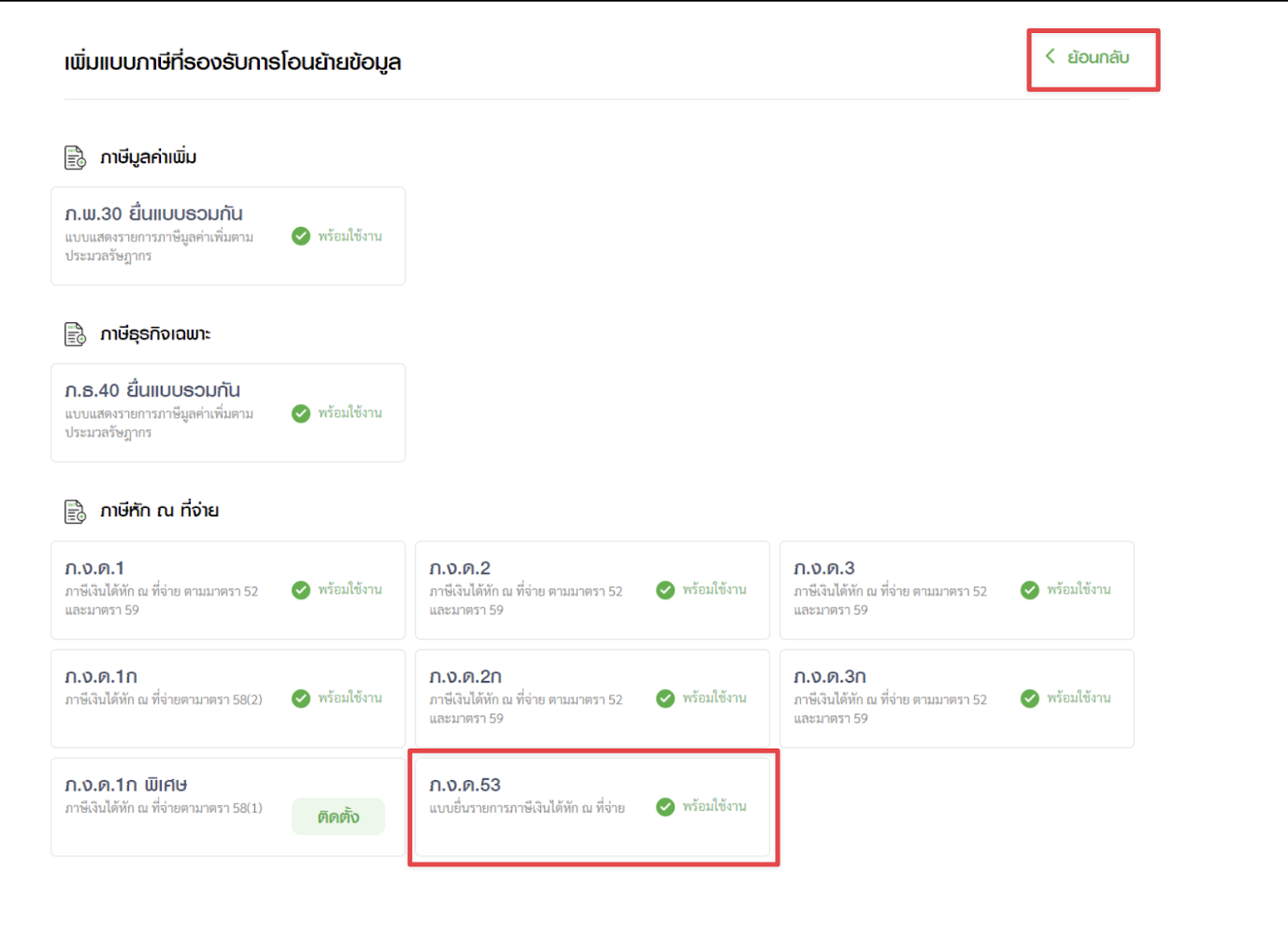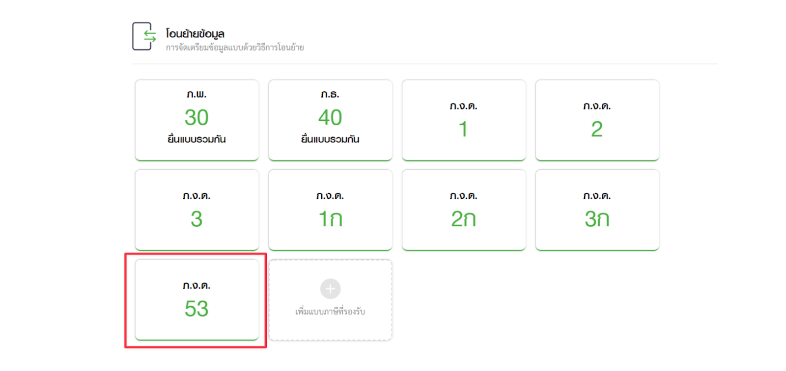 - โปรแกรมจะแสดงแบบภาษีที่เลือกไว้ จากนั้นให้คลิกเลือกแบบภาษีที่ต้องการโอนย้ายข้อมูล ตัวอย่างเช่น แบบภาษี ภ.ง.ด. 53