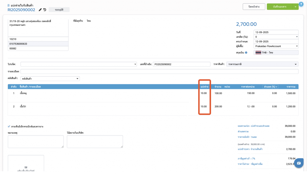 สามารถเลือกระบุจำนวนเงินหรือเปอร์เซ็นต์ที่ต้องการแบ่งจ่ายชำระค่าสินค้าที่ ท้ายเอกสาร และกดบันทึกจะได้เอกสารแบ่งจ่ายที่ต้องการ