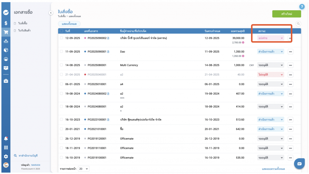 เอกสารใบสั่งซื้อ จะเปลี่ยนเป็นสถานะแบ่งจ่าย