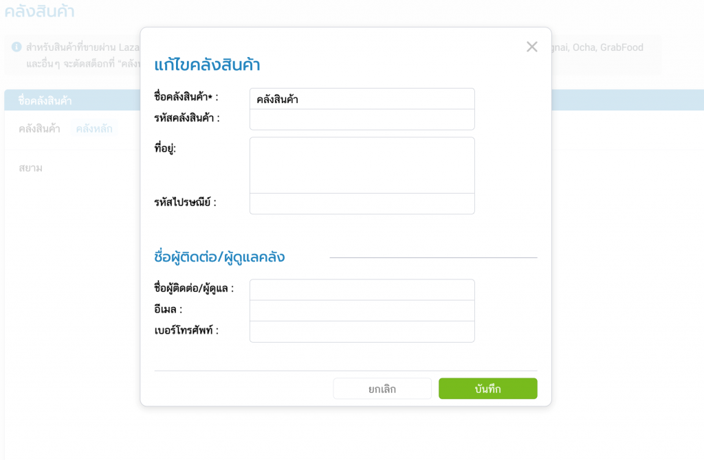 2. แก้ไขชื่อคลังสินค้าตามที่ต้องการ นอกจากนี้ยังสามารถใส่ข้อมูลอื่นๆ เพิ่มเติมได้ เช่น รหัสคลังสินค้า,ที่อยู่,รหัสไปรษณีย์,ชื่อผู้ติดต่อ/ผู้ดูแล,อีเมล,เบอร์โทรศัพท์ และ กด บันทึก
