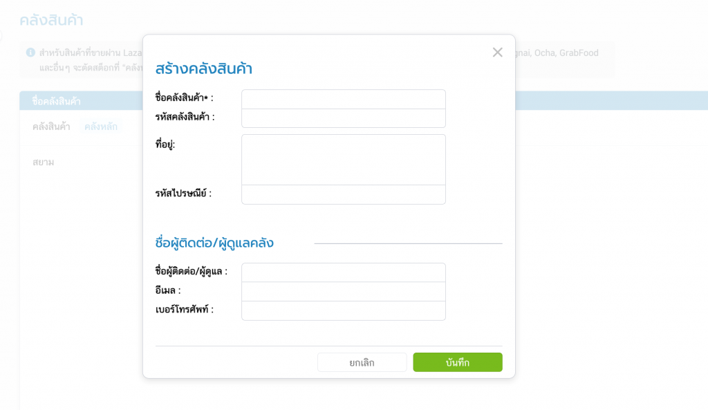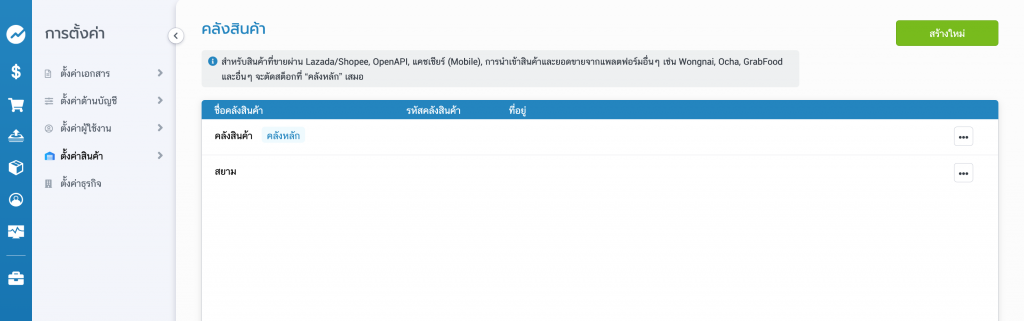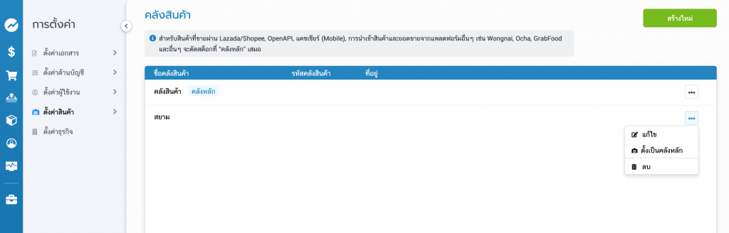 ไปที่เมนูการตั้งค่า > ตั้งค่าสินค้า > คลังสินค้า > สร้างใหม่